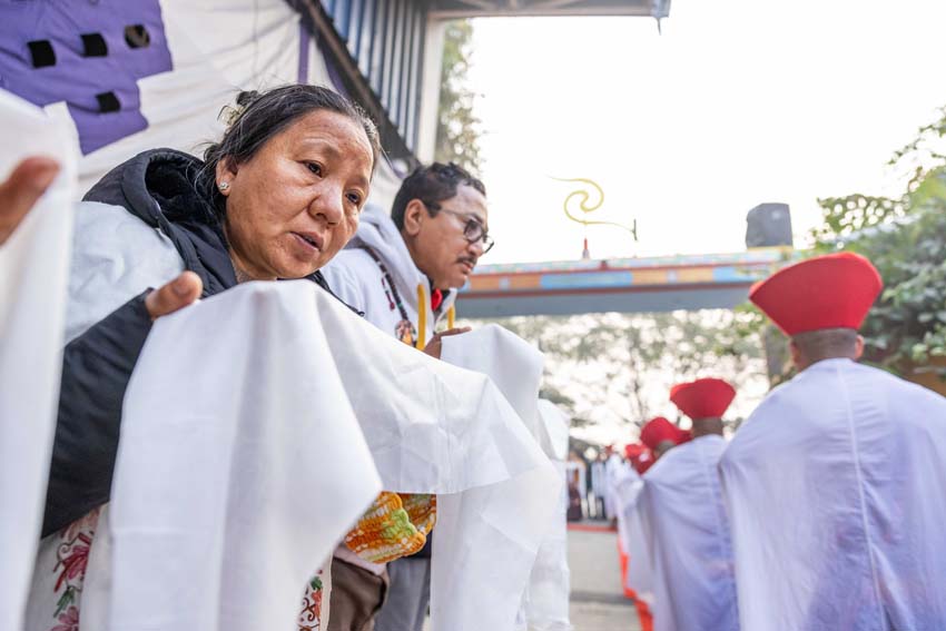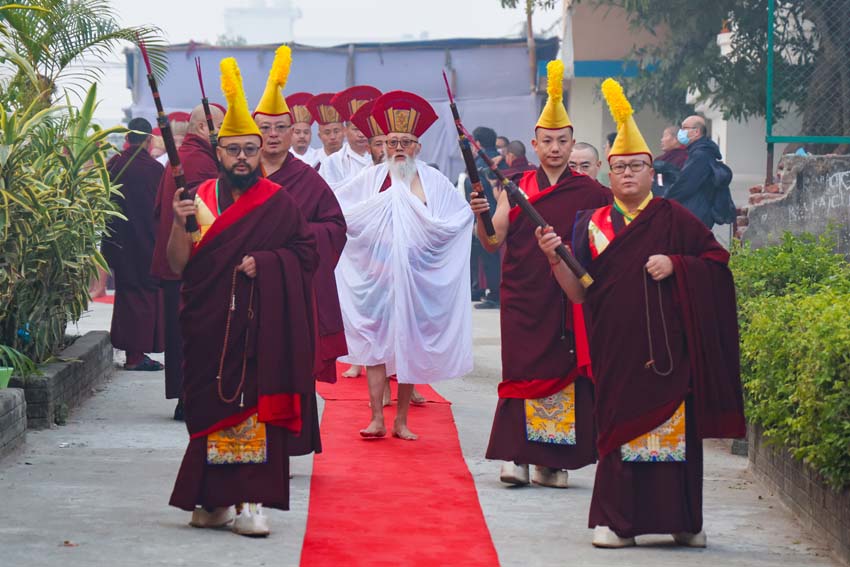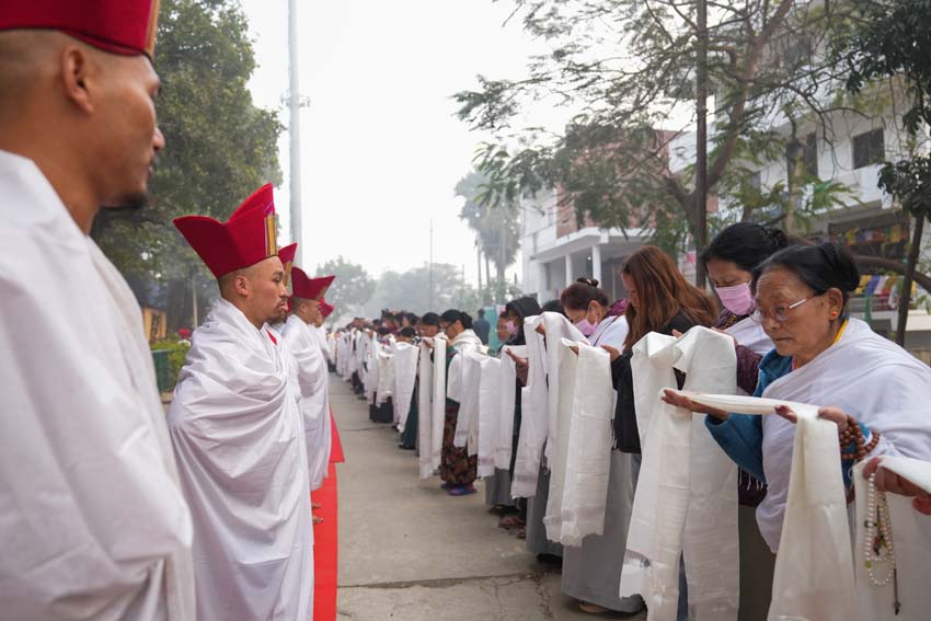 At 6.30am the retreat monks emerged from Tergar shrine hall and wrapped wet sheets around their bodies—the traditional way of proving achievement in tummo is to dry a wet sheet with the body heat generated by the practice. Wearing lower garments, meditation belts, meditation hats and the wet white robes, they proceeded clockwise along a carpeted route from Tergar monastery to the Kagyu Monlam Pavillion, greeted by crowds of devotees who lined the path.