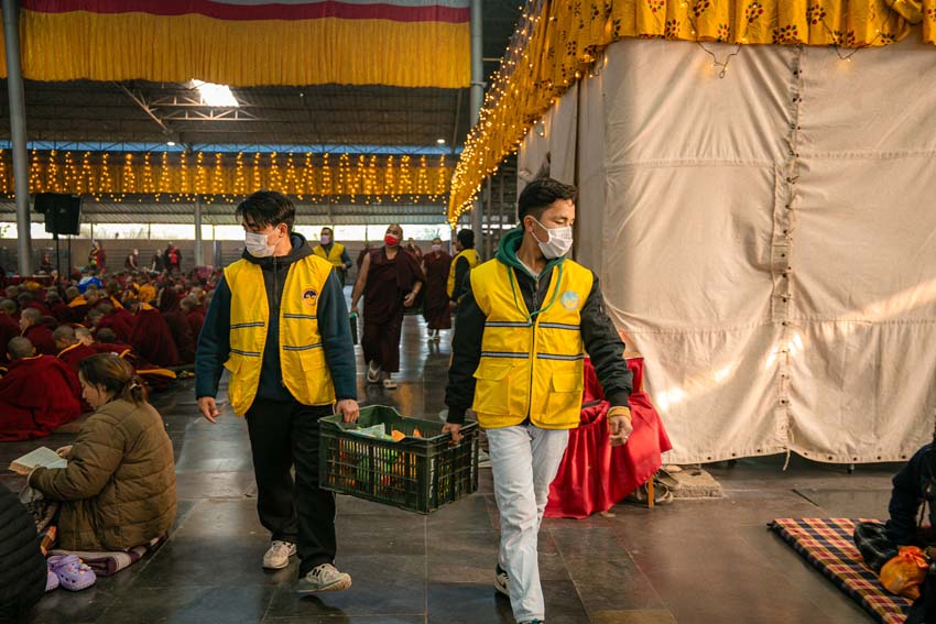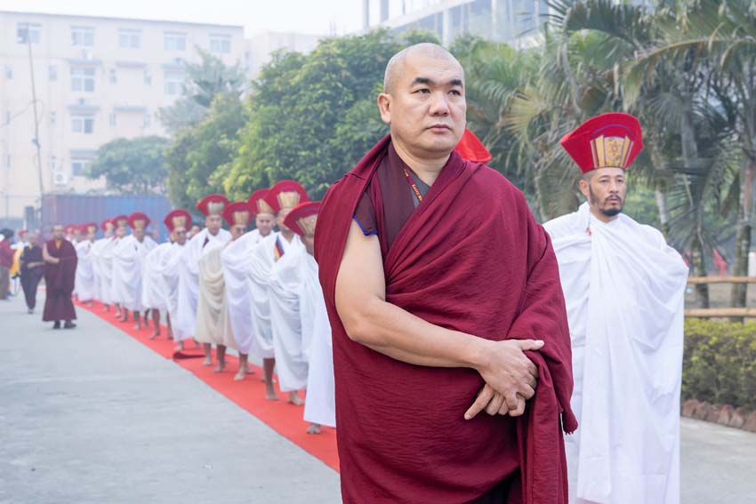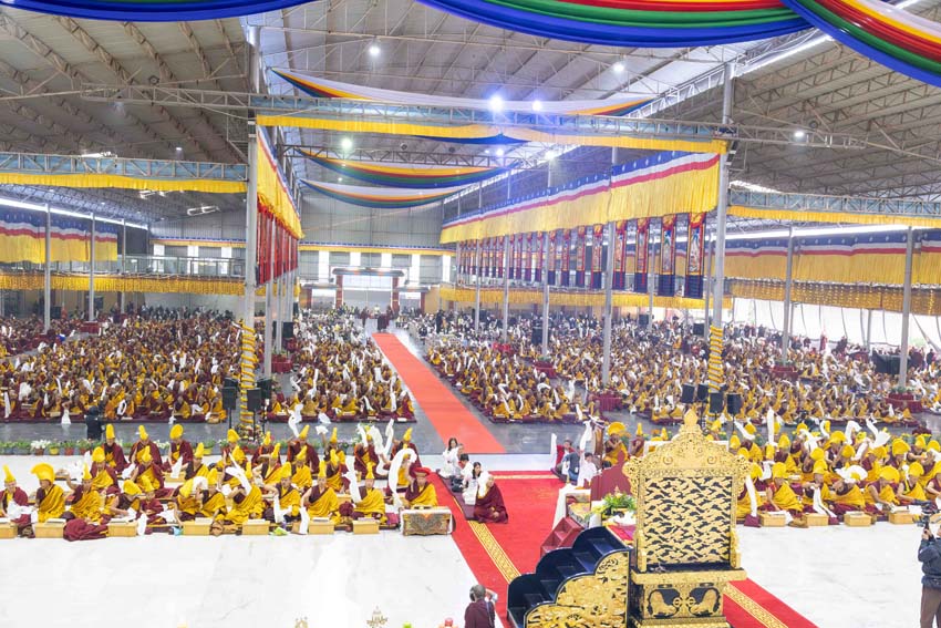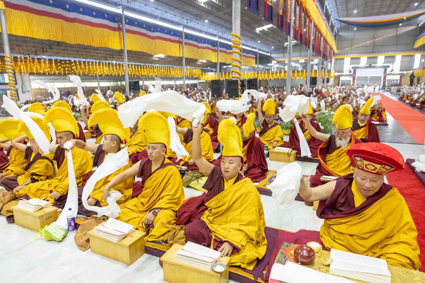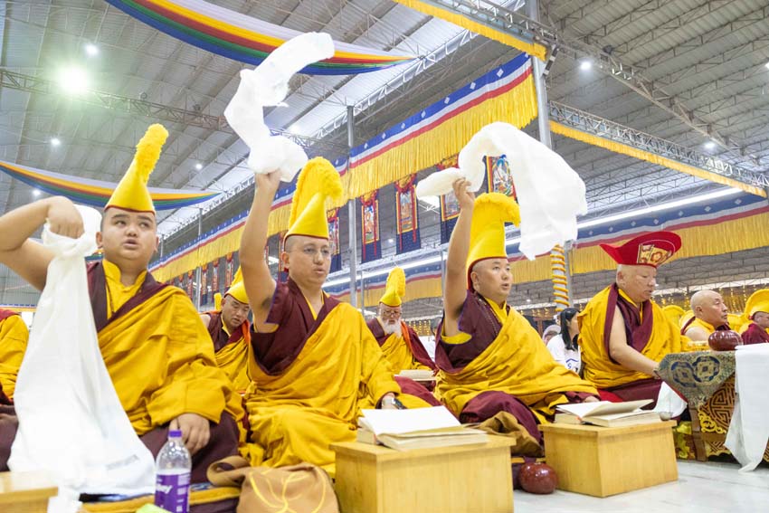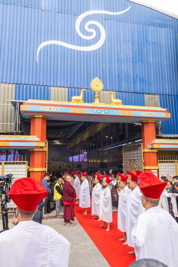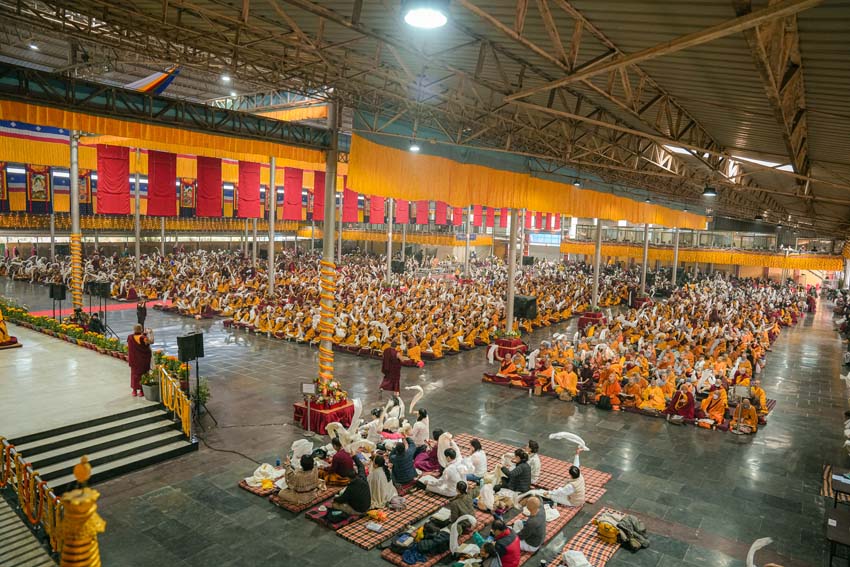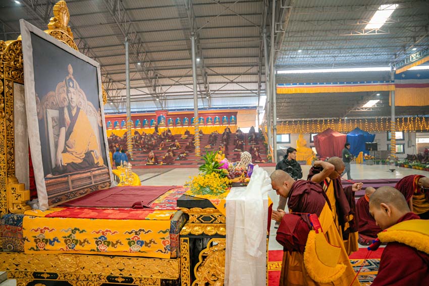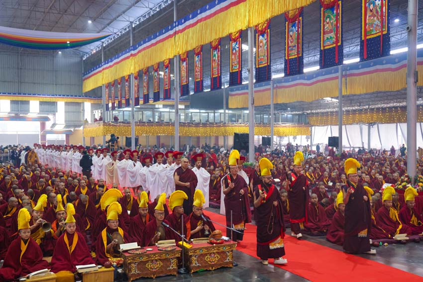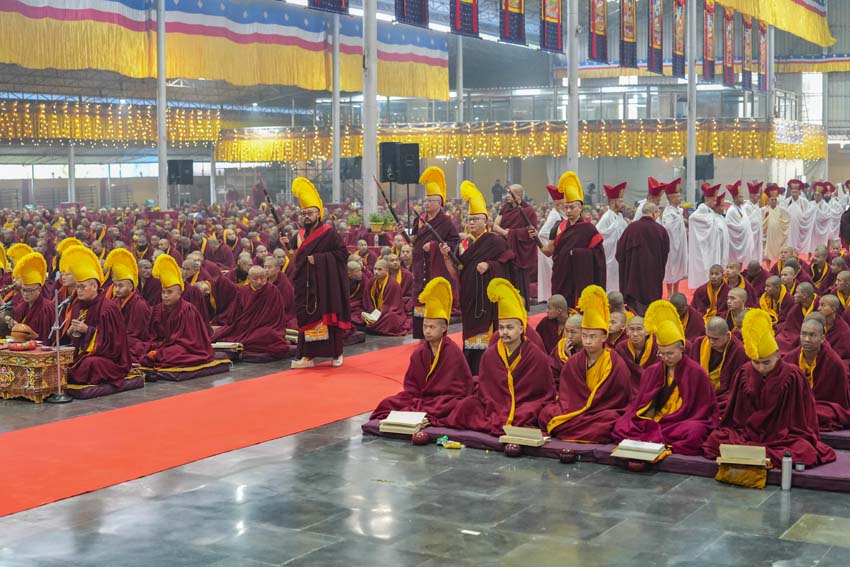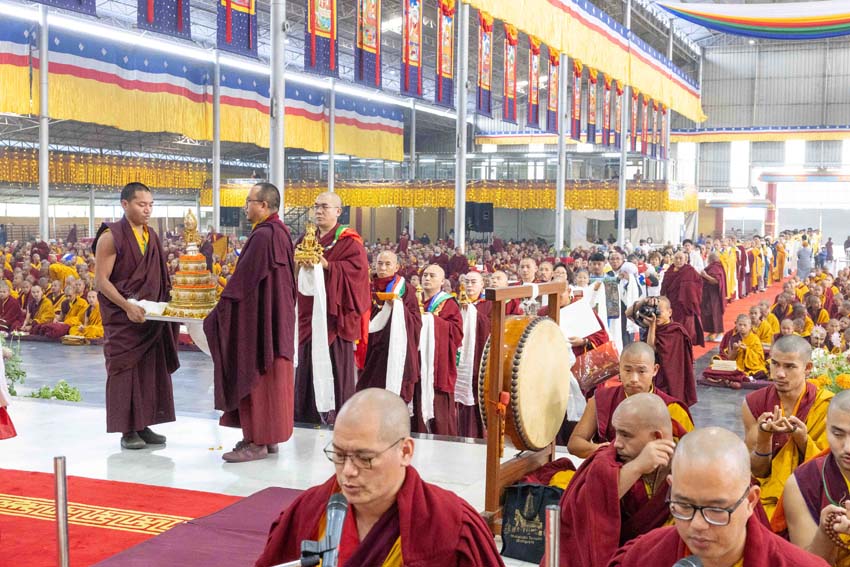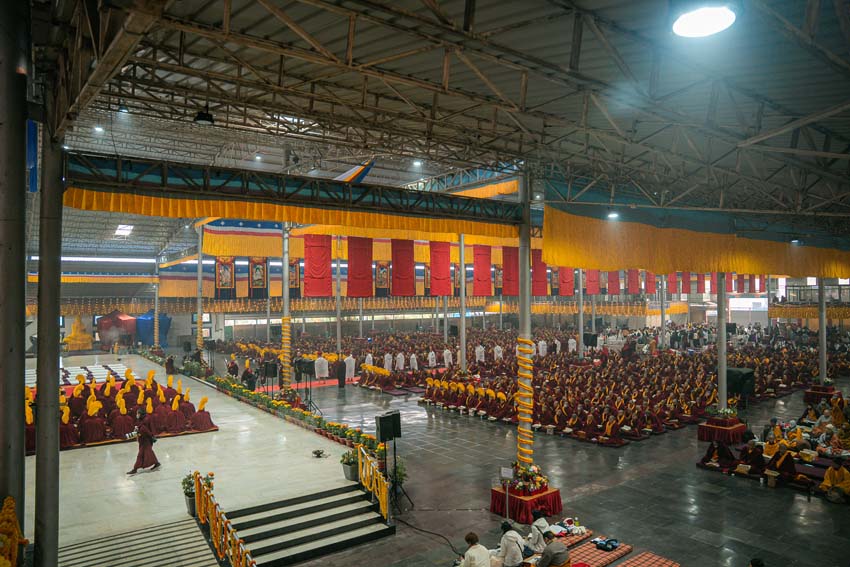 During the fourth branch of inviting, the retreat practitioners entered the pavillion through the main gate and took their seats on the right side of the stage. During the eleventh branch, the offering section, when making the offering of practice, monastics from the Kamtsang shedras engaged in a demonstration philosophical debate. After the debate concluded, a monk from Tergar shedra summarised what had been said to complete the offering of practice.