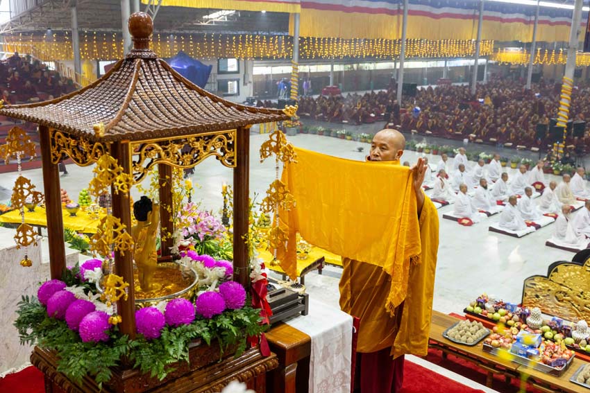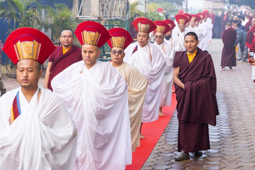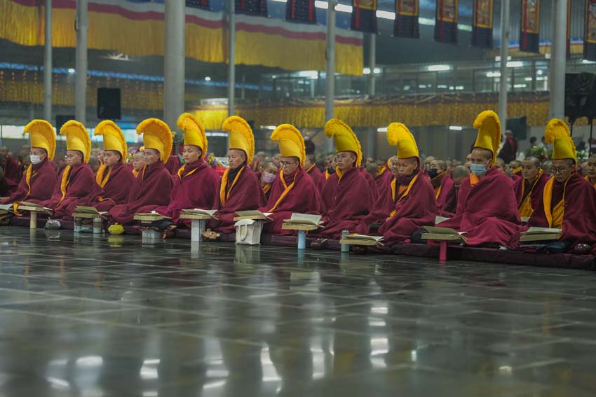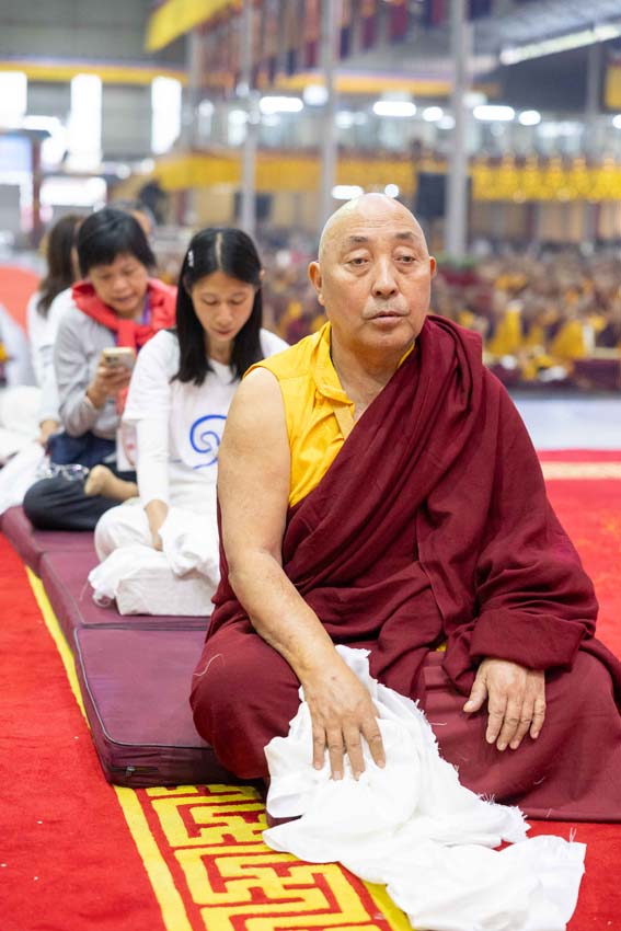 In the Monlam Pavillion monks. Nuns and lay practitioners gathered to receive the Mahayana sojong vows from Kyabgon Zurmang Gharwang Rinpoche and then recited the opening prayers of the first session.