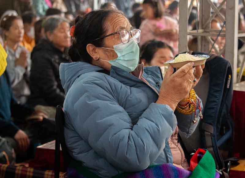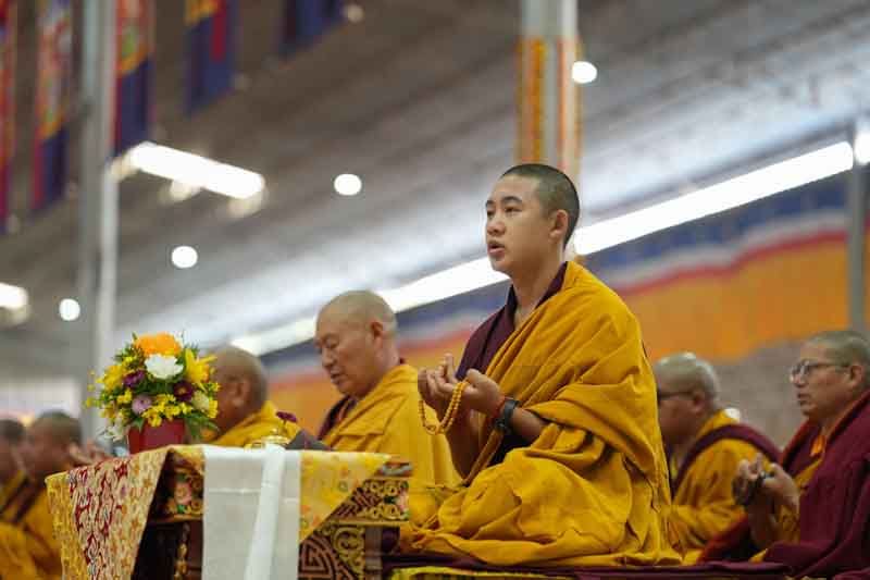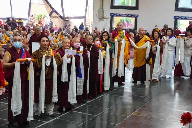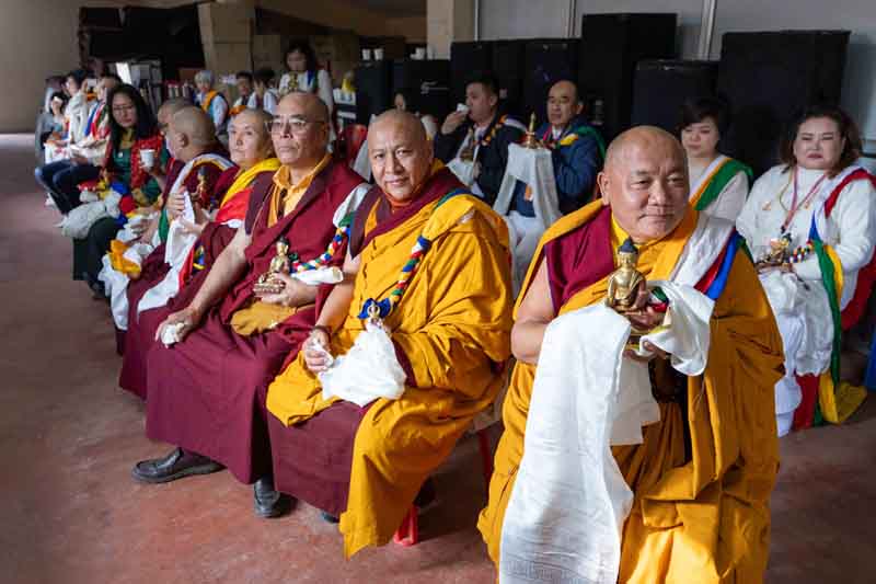 In the morning, His Eminence Goshir Gyaltsab Rinpoche performed the main empowerment ritual. In the afternoon, beginning at 2 o'clock, he started bestowing the actual empowerment. First, His Eminence Gyaltsab Rinpoche, dressed in elaborate silk brocade robes, was escorted into the pavillion and took his seat on the great dharma throne. Kyabje Bokar Choktrul Rinpoche and Bokar Khenpo Rinpoche Lodro Dönyo offered prostrations on behalf of the entire assembly. The chant master led the recitation of the short supplication to Dorje Chang and the Thirty-Seven Mandala Offering. The head lamas and sponsors from Gyaltsab Rinpoche’s Ralang Monastery in Sikkim offered a threefold body-speech-mind mandala.