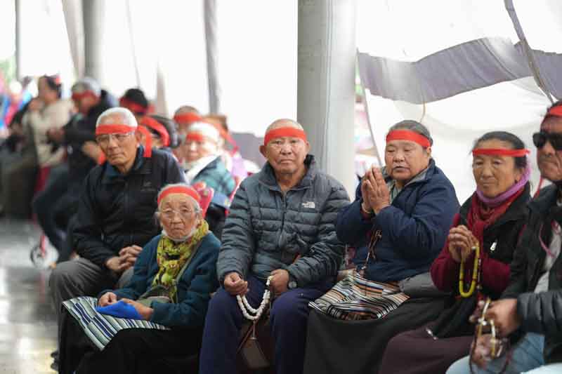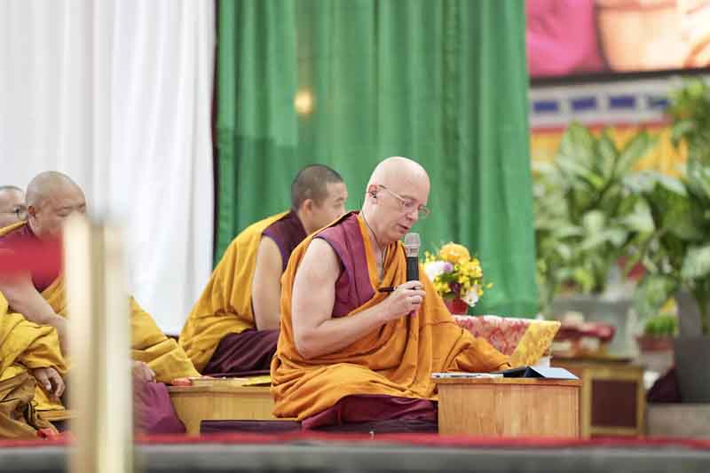 Then His Eminence Gyaltsab Rinpoche gave extensive and profound explanations of the stages of the empowerment. Finally, he completed the bestowing of the full main empowerment of Vairocana Abhisaṃbodhi to the entire assembly. During the empowerment transmission, Kyabje Bokar Choktrul Rinpoche and other high lamas received the empowerment blessings directly, on behalf of everyone. At the conclusion of the empowerment there was a thanksgiving ceremony, during which Lama Karma Chodrak, the director of the Monlam Chenmo, along with key staff members, offered an elaborate three-fold mandala with representations.
