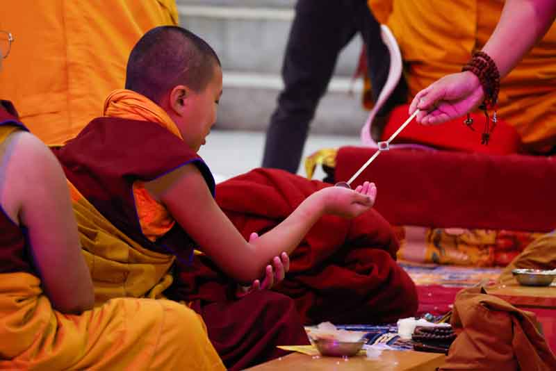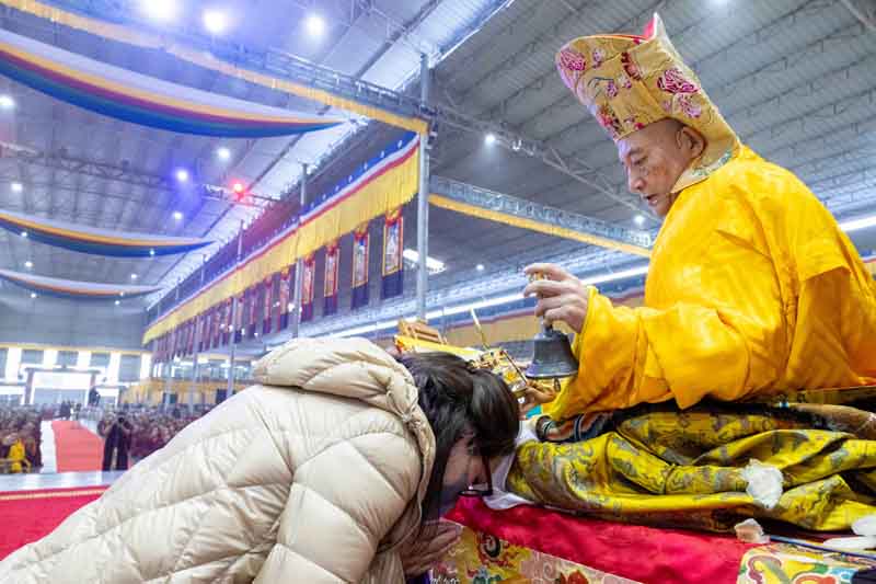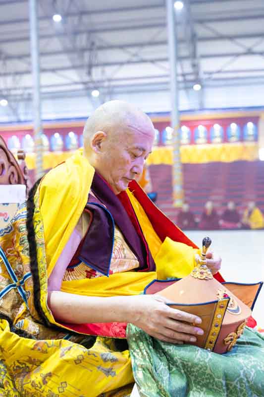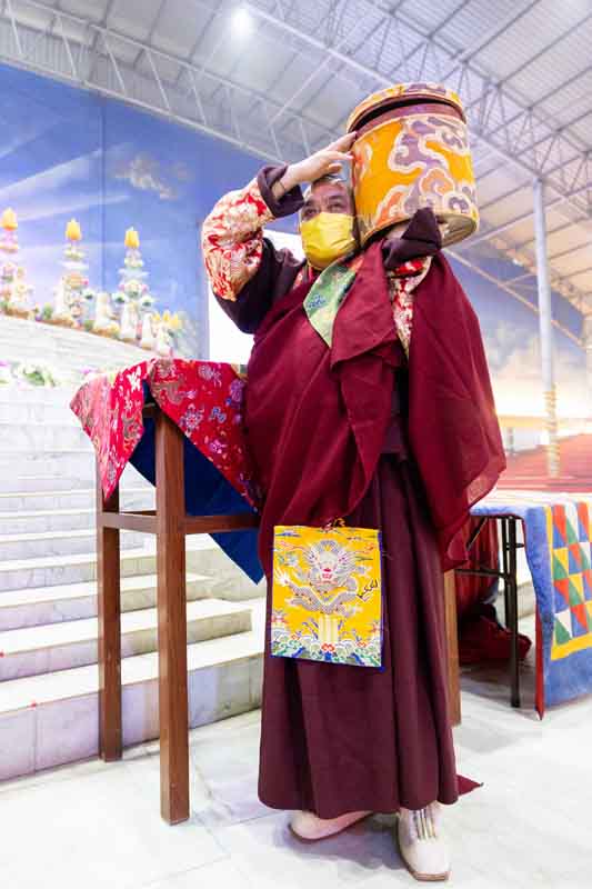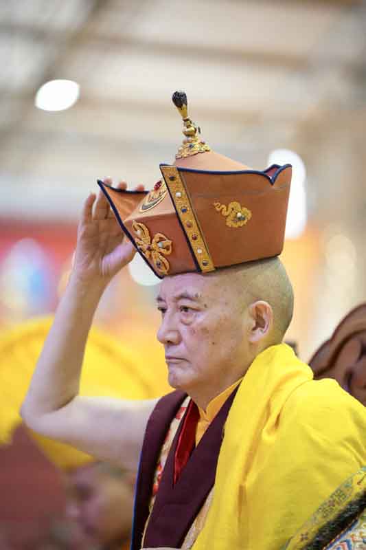 At 9:30 am, Kyabgon Drung Goshir Gyaltsab Rinpoche and the Red Crown in its brocade covered box, were escorted into the Monlam pavillion in an elaborate procession. Chief Minister Prem Singh Tamang left his seat and prostrated to Rinpoche with great devotion. Following a mandala offering from the Sikkimese, led by the Chief Minister and the Minister for Ecclesiastical Affairs, the ritual began. At the conclusion of the ceremony, Rinpoche spoke briefly.