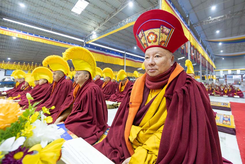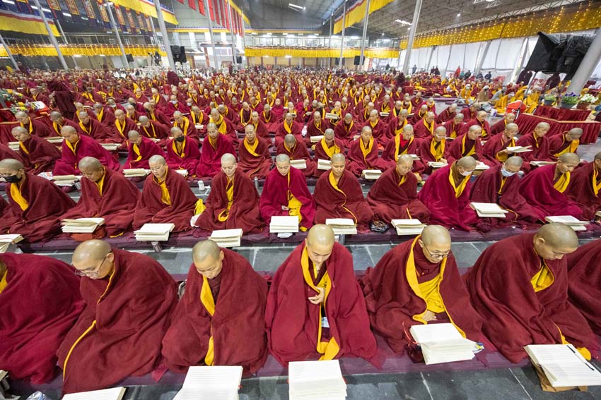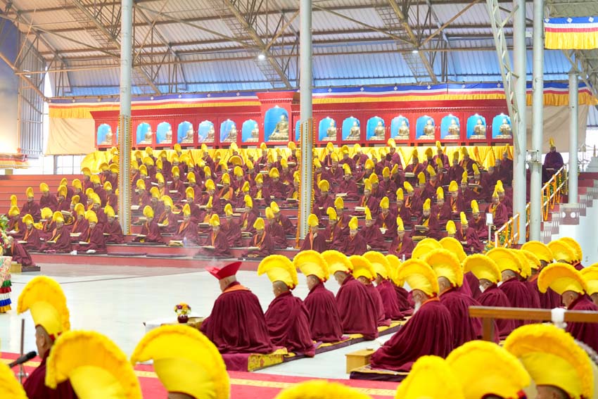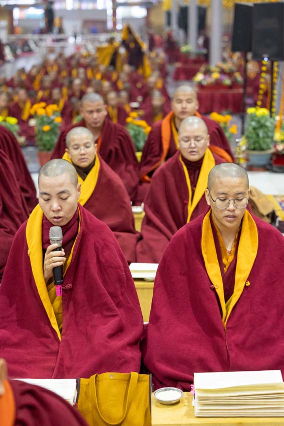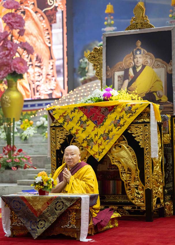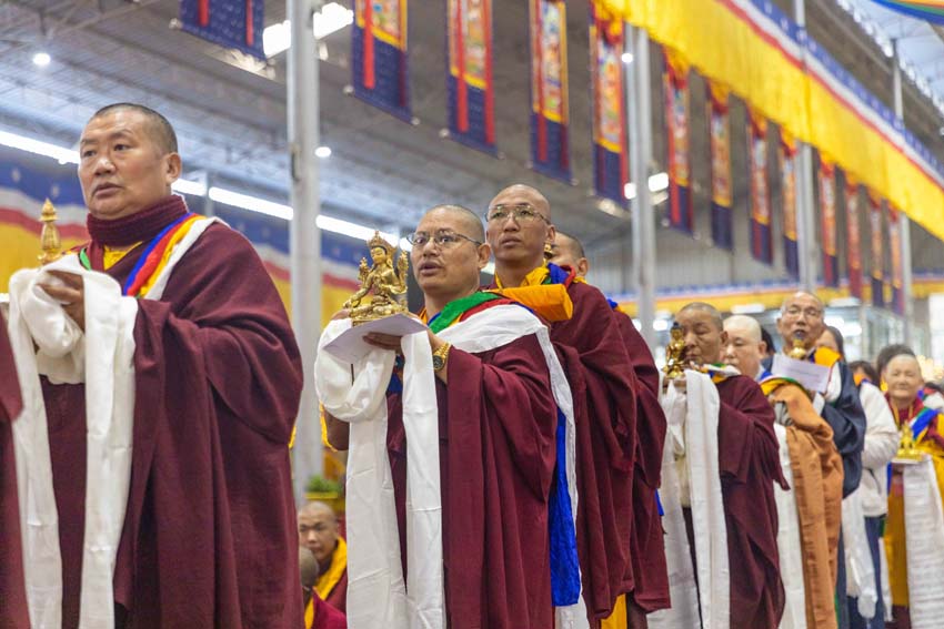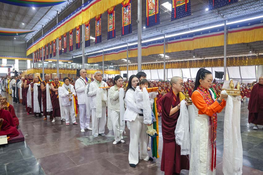 ཕྱག་ཚོད་9:00-10:30 པའི་ཐོག་མཎྜལ་ཚོམ་བུ་བདུན་མ་དང་བྱང་སྡོམ་བརྒྱུད་འདེབས་སོགས་དབྱངས་རྟ་སྙན་པོས་སྣ་དྲངས་ཏེ། དཔལ་༧རྒྱལ་དབང་༧ཀརྨ་པ་མཆོག་ལ་དད་ཅན་སྦྱིན་བདག་རྣམ་པས་སྐུ་གསུང་ཐུགས་ཀྱི་མཎྜལ་རྟེན་དོད་འདེགས་འབུལ་ཞུས། ཐེངས་དེའི་སྨོན་ལམ་སྐབས་ཀྱི་གསུང་ཆོས་དཔལ་ལྡན་དུས་གསུམ་མཁྱེན་པའི་ཚོགས་ཆོས་བཀའ་ཁྲིད་དབུ་ཚུགས་གནང་། བརྗོད་བྱ་གཙོ་བོ་ཤེས་རབ་ཀྱི་སྐོར་དང་། དེའི་ནང་ནས་ཐོས་བསམ་སྒོམ་པའི་ཤེས་རབ་སོགས་ཀྱི་སྐོར་གོ་དོན་རྒྱ་ཆེ་ལ་གཏིང་ཟབ་པའི་དཔེ་མཚོན་དང་བཅས་པའི་ཞི་བསིལ་དམ་པའི་ཆོས་ཀྱི་བདུད་རྩིས་ཚིམ་པར་མཛད་ཅིང་། དད་ལྡན་སེར་སྐྱ་ཐམས་ཅད་མཐོང་ཐོས་དྲན་རེག་གིས་སྐལ་བཟང་དགའ་སྟོན་མངོན་དུ་གྱུར། དེའི་རྗེས་རྗེ་ཙོང་ཁ་པས་མཛད་པའི་ལམ་རིམ་སྨོན་ལམ་སྙན་པའི་དབྱངས་ཀྱི་རྟ་དྲངས་སྐབས། དད་ལྡན་ཕྱི་ནང་མི་རིགས་སེར་སྐྱ་མཐའ་དག་གི་དད་པའི་སྤུ་ལོང་རབ་ཏུ་གཡོས་ཤིང་ཐལ་མོ་སྦྱར། ཐར་པ་ངེས་ལེགས་ཀྱི་བག་ཆགས་བཟང་པོ་འཇོག་པའི་རྒྱུར་གྱུར་པའི་སྐྱ་རེངས་ཤར།