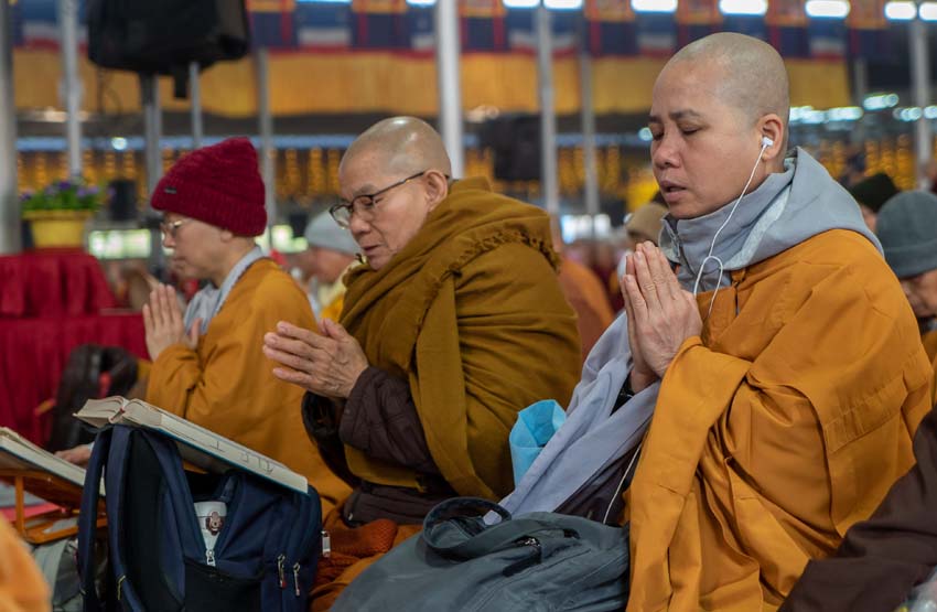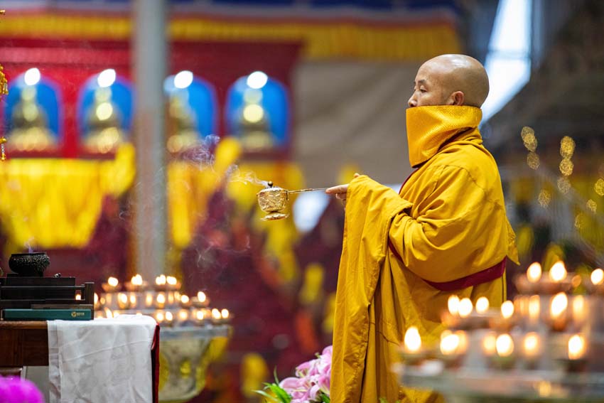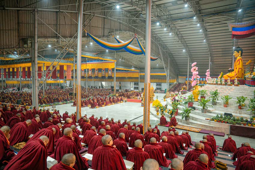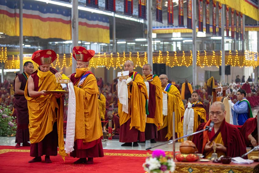 ཚོགས་ཐེངས་དང་པོའི་བར་སེང་གྲུབ་རྗེས་ཕྱག་ཚོད་ ༩ པའི་ཐོག་དཔལ་༧རྒྱལ་དབང་༧ཀརྨ་པ་ཡིད་བཞིན་ནོར་བུ་མཆོག་གིས་དྲྭ་རྒྱ་བརྒྱུད་དེ་དཔལ་ལྡན་དུས་གསུམ་མཁྱེན་པའི་ཚོགས་ཆོས་ཆོས་དྲུག་མའི་གསུང་ཆོས་དབུ་ཚུགས་མཛད། དེ་ཡང་ཐོག་མར་མཎྜལ་ཚོམ་བུ་བདུན་མའི་ཞལ་འདོན་གསུངས་པ་དང་ཝེཊ་ནཱམ་སོགས་འཛམ་གླིང་ཡུལ་གྲུ་ཁག་ནས་ཕེབས་པའི་དད་ལྡན་སྦྱིན་པའི་བདག་པོ་ཁག་ཅིག་ནས་༧རྒྱལ་དབང་ཡིད་བཞིན་ནོར་བུ་མཆོག་ལ་མཎྜལ་སྐུ་གསུང་ཐུགས་རྟེན་འདེགས་འབུལ་ཞུས། དེ་ནས་དྲུང་བདུན་པ་ཆོས་གྲགས་རྒྱ་མཚོས་མཛད་པའི་བྱིན་ཆེན་གྱི་བྱང་སྡོམ་བརྒྱུད་འདེབས་དང་ཆོས་འཁོར་སྐོར་བར་གསོལ་བའི་ཞལ་འདོན་ཚིགས་བཅད་རྣམས་གསུངས་ཤིང་། ༧རྒྱལ་དབང་ཡིད་བཞིན་ནོར་བུ་མཆོག་དྲྭ་ཐོག་ཏུ་ཕེབས་ནས་གསུང་ཆོས་བཀའ་དྲིན་བསྐྱངས།
