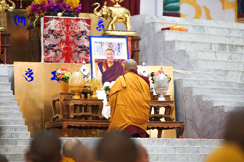 The extensive Ritual of Offerings to the Gurus, always performed on the last day of the Kagyu Monlam Chenmo, was composed in 2005 by His Holiness the 17th Karmapa. It is a compilation drawn from many famous Buddhist texts. The puja often serves as a memorial to a particular Lama who has passed away, and this year a large portrait photograph of the Eighth Kyabje Dorzong Rinpoche was placed centrally below the shrine.