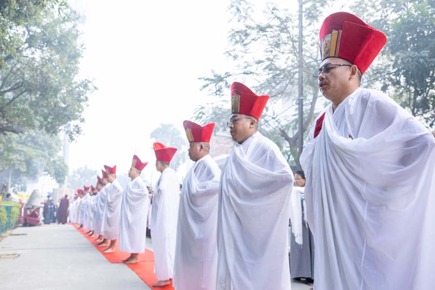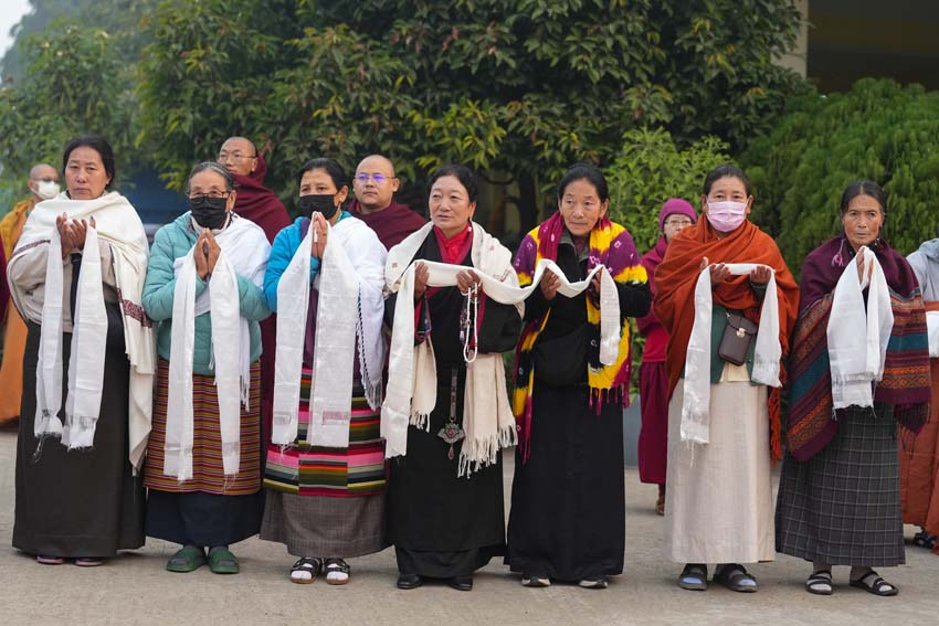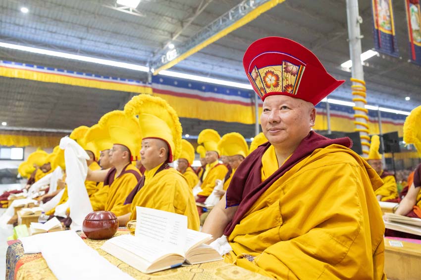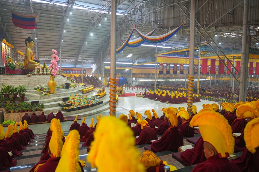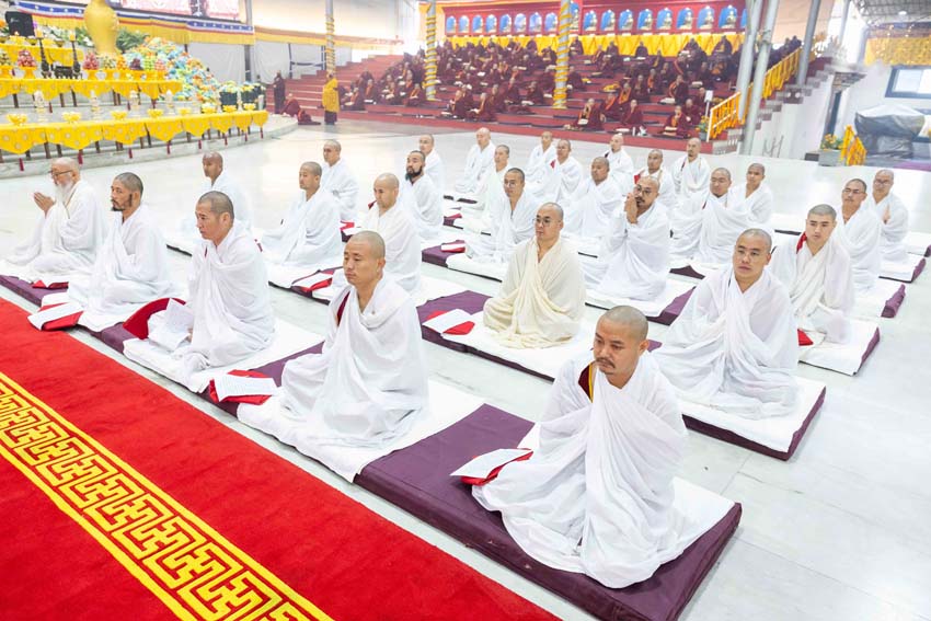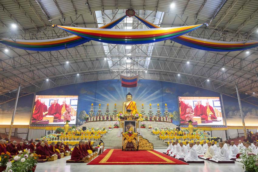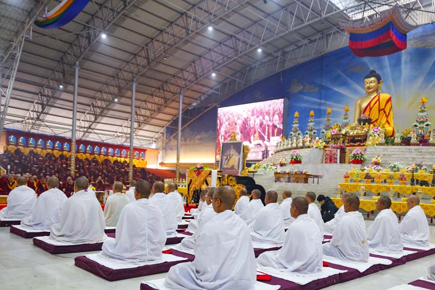In the Monlam Pavillion monks. Nuns and lay practitioners gathered to receive the Mahayana sojong vows from Kyabgon Zurmang Gharwang Rinpoche and then recited the opening prayers of the first session.