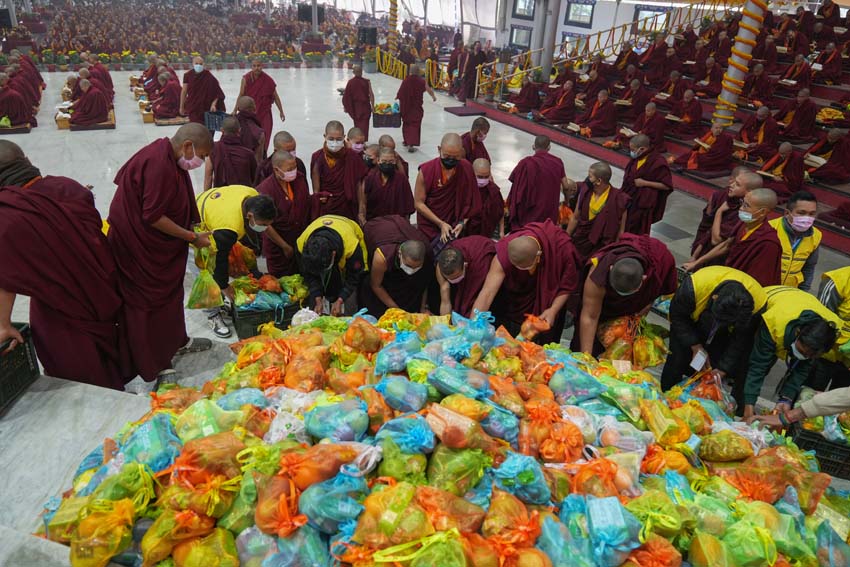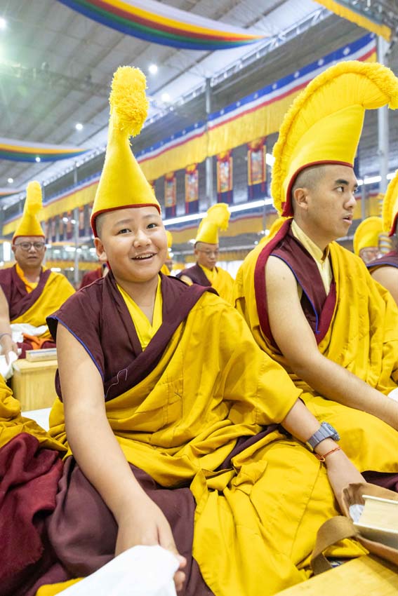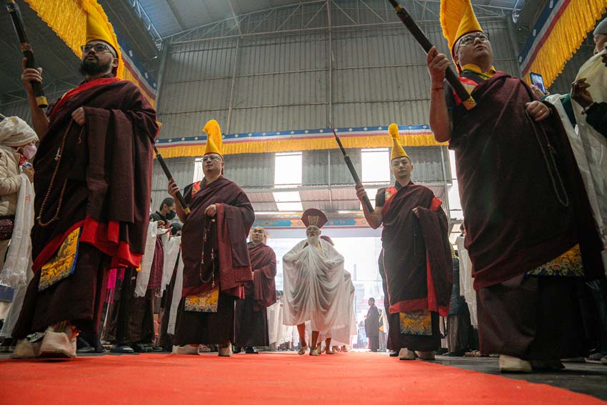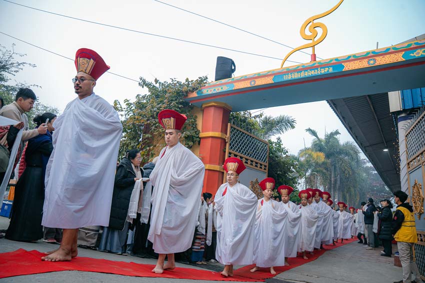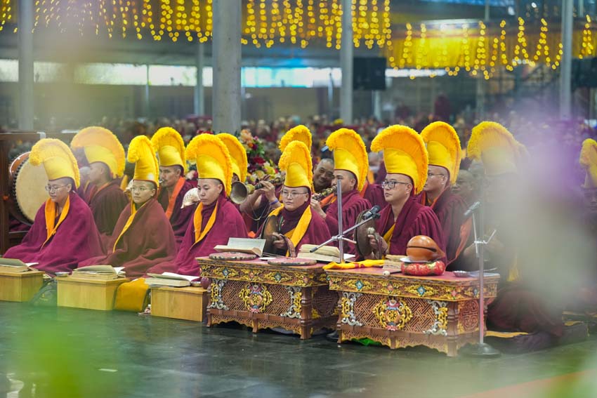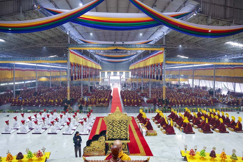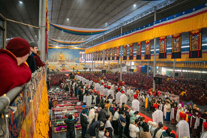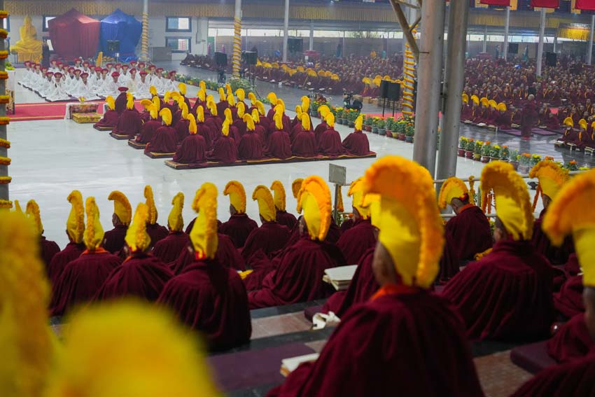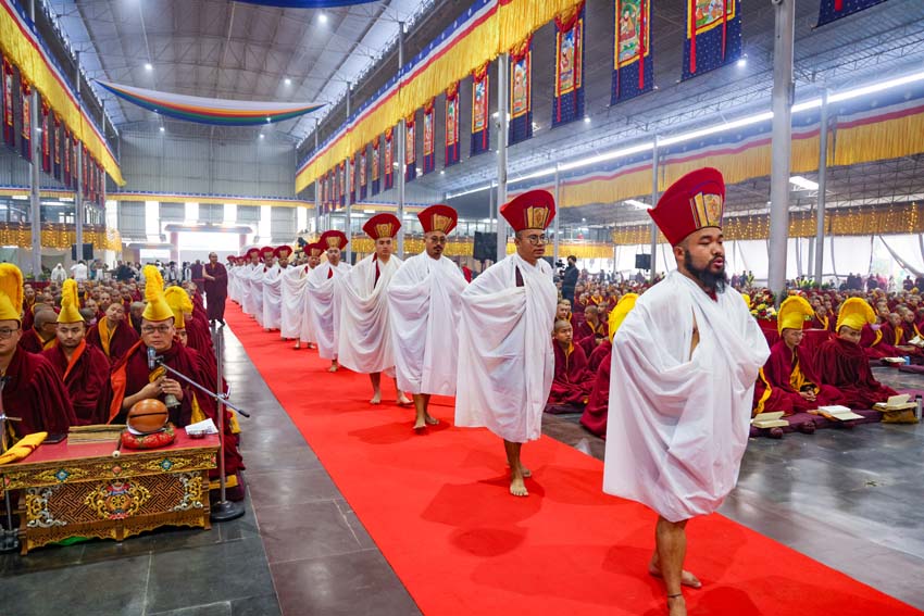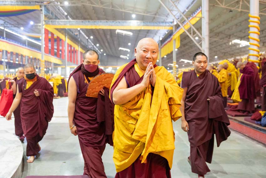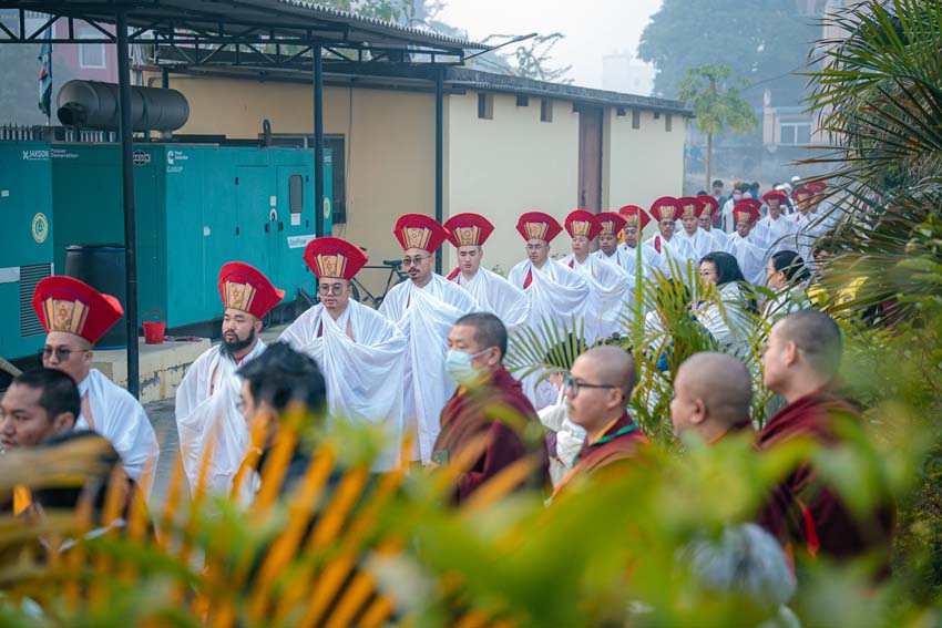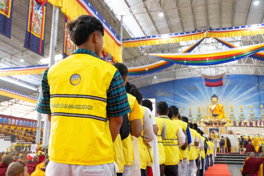 During the fourth branch of inviting, the retreat practitioners entered the pavillion through the main gate and took their seats on the right side of the stage. During the eleventh branch, the offering section, when making the offering of practice, monastics from the Kamtsang shedras engaged in a demonstration philosophical debate. After the debate concluded, a monk from Tergar shedra summarised what had been said to complete the offering of practice.