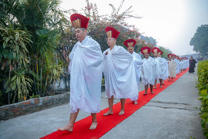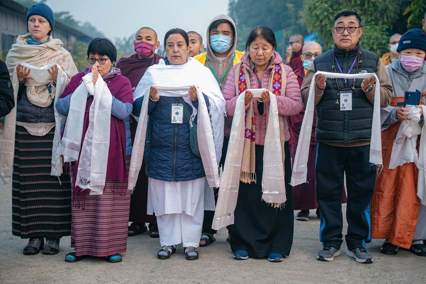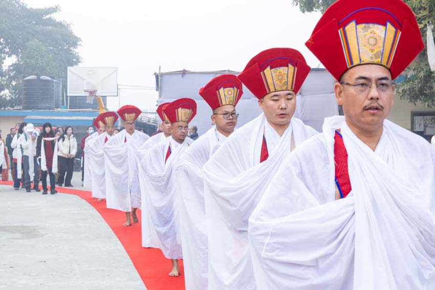 At 6.30am the retreat monks emerged from Tergar shrine hall and wrapped wet sheets around their bodies—the traditional way of proving achievement in tummo is to dry a wet sheet with the body heat generated by the practice. Wearing lower garments, meditation belts, meditation hats and the wet white robes, they proceeded clockwise along a carpeted route from Tergar monastery to the Kagyu Monlam Pavillion, greeted by crowds of devotees who lined the path.