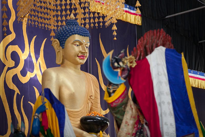 Just behind the folding screen rises a three-meter tall statue of Bernakchen, his face veiled by khatas of five colors so that only his flaming hair is visible. Also covered in silks are Mahakali riding her blue mule to Bernakchen’s right and to his left is Dorje Lekpa. These three statues were newly created by Gyaltsap Rinpoche as he consulted texts and his experience while working closely with a sculptor.