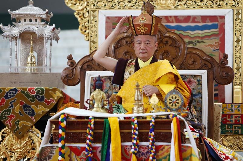 Gyaltsab Rinpoche’s throne was placed directly in front of the Gyalwang Karmapa’s high throne. To the right, on an elegant golden table covered with brocade, sat a delicately wrought silver pavilion.