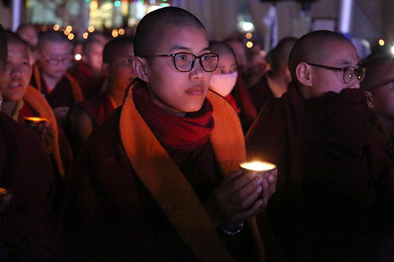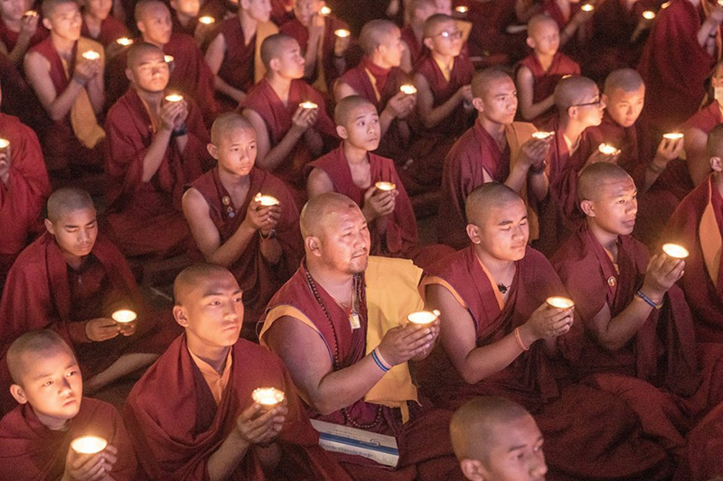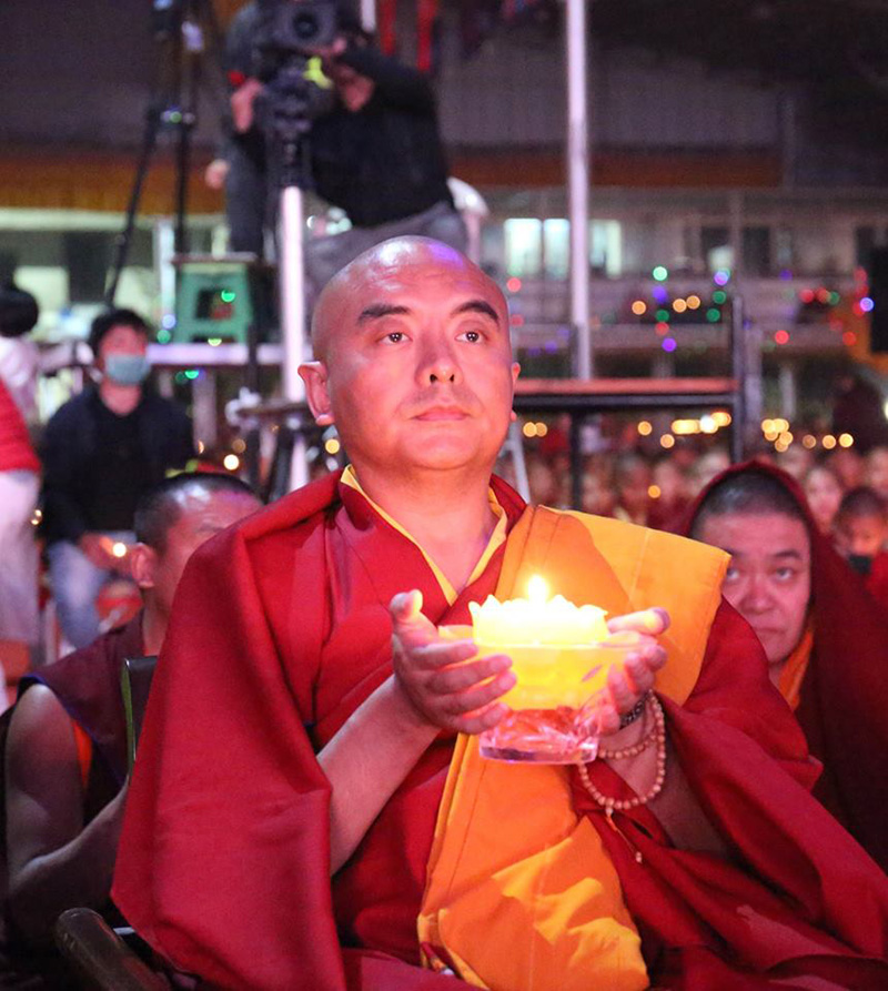 13. Although physically absent, His Holiness leads the Lamp Offering.