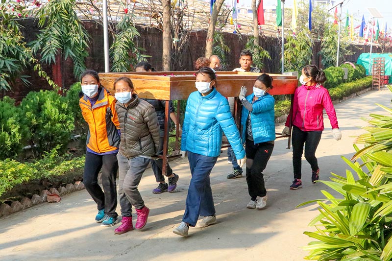 Their numbers have grown over the years as their duties have expanded and their invaluable contribution to the smooth running of the Monlam has been recognised. This year 100 students have come, equally divided between boys and girls. The youngest is fifteen years old and the oldest is twenty. Their main responsibility is supporting the work of the security team; they help run the check-points and supervise all the entrances to restricted areas within the Monlam Pavillion. In addition, when the stage has to be changed for the next puja, they will be there, helping the young monks to heft heavy furniture or moving mattresses and seats. But you will also see them interacting with little children, fetching chairs for the elderly or helping to push someone in a wheelchair to a better place where they can see the stage, and generally helping out. The motto of the TCV school organisation is “Others before self”, and these young people can truly be said to put it into action.