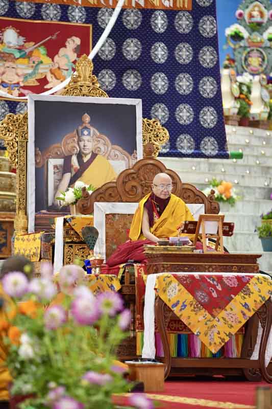 In the morning, His Eminence Goshir Gyaltsab Rinpoche performed the main empowerment ritual. In the afternoon, beginning at 2 o'clock, he started bestowing the actual empowerment. First, His Eminence Gyaltsab Rinpoche, dressed in elaborate silk brocade robes, was escorted into the pavillion and took his seat on the great dharma throne. Kyabje Bokar Choktrul Rinpoche and Bokar Khenpo Rinpoche Lodro Dönyo offered prostrations on behalf of the entire assembly. The chant master led the recitation of the short supplication to Dorje Chang and the Thirty-Seven Mandala Offering. The head lamas and sponsors from Gyaltsab Rinpoche’s Ralang Monastery in Sikkim offered a threefold body-speech-mind mandala.