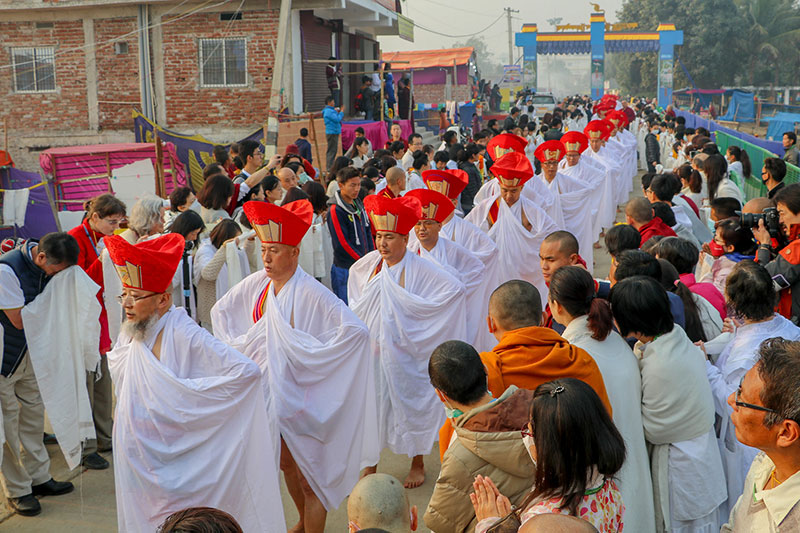 Having stayed up the whole night practicing, on February 19 in the early morning of the last day of the Monlam, the lamas wore a long white cloth wrapped around their bodies, the red Kagyu hat, a yoga belt, and short pants when they exited the main shrine hall of Tergar Monastery. With their arms on their hips and slowly turning side to side, they walked to the Monlam Pavilion between long rows of disciples with khatas to honor their efforts in practice. The lamas came down the central aisle and sat on the stage to the Karmapa’s left while the ordained monks sat on his right. As part of the Offerings to the Guru, the retreatants sang Milarepa’s song, the Essence of Dependent Arising, and received a specially blessed gift from the Karmapa. It was an auspicious beginning to the revival of another key element in the Kamtsang Kagyu lineage, famous for being a lineage of great practitioners.