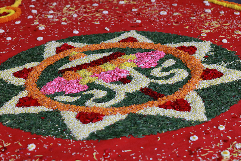 10. The wide central aisle with its red carpet was strewn with flower petals. Garlands of orange and gold marigolds arranged as scrollwork framed the central medallions representing the eight auspicious symbols: the parasol, golden fish, vase, utpala flower, conch, glorious knot, victory banner, and eight spoked wheel.