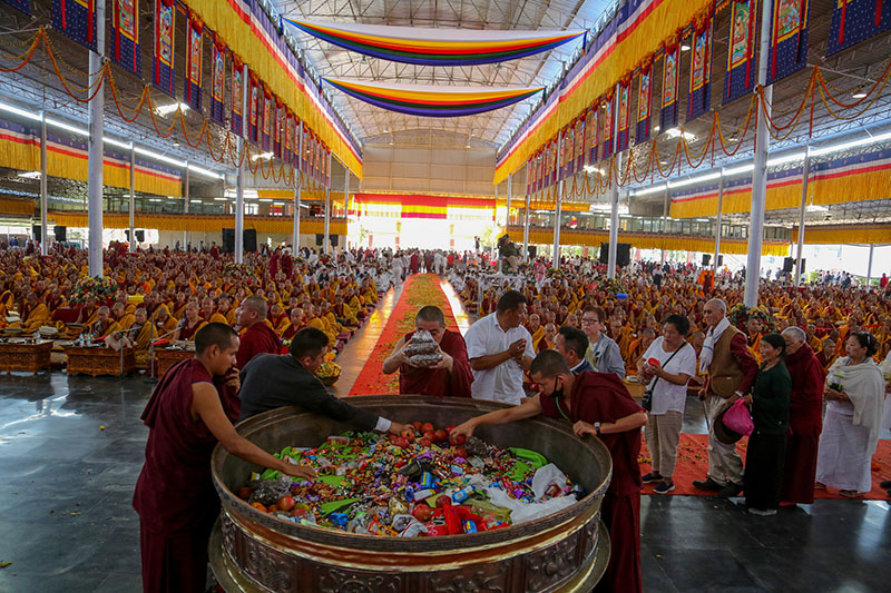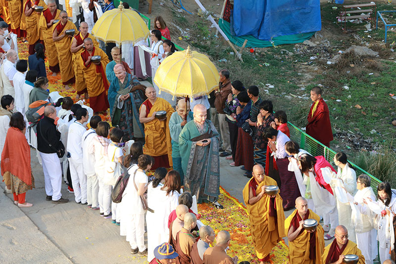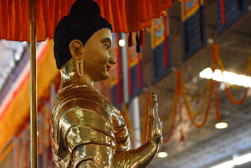 Leading the sixteen-arhat procession were the gyaling players, followed by victory banners and parasols, and then the incense bearers. Each arhat was accompanied by a parasol bearer in similar dress. In their beautiful robes designed by a famous Chinese costume maker, the arhats were regal and magnificent. The monastics held begging bowls in precise style: left hand under the bowl, right hand resting on the rim of the bowl. They looked down or straight ahead, chanting mantras and walking meditatively. Finally, a carriage conveyed the standing Buddha, gleaming in the early morning sun, a parasol swirling just above its head. The entire procession turned into the pavilion and processed down the aisle. Patrons offered baskets brimming with fruit, nuts, and other delicacies. Then, as the assembly chanted Prostrations and Offering to the Sixteen Arhats, followed by praises and auspicious prayers, each lay devotee had the precious opportunity to make offerings. The pavilion was packed, and for about an hour, the young dharmapalas from Bhutan patiently directed a stream of people.