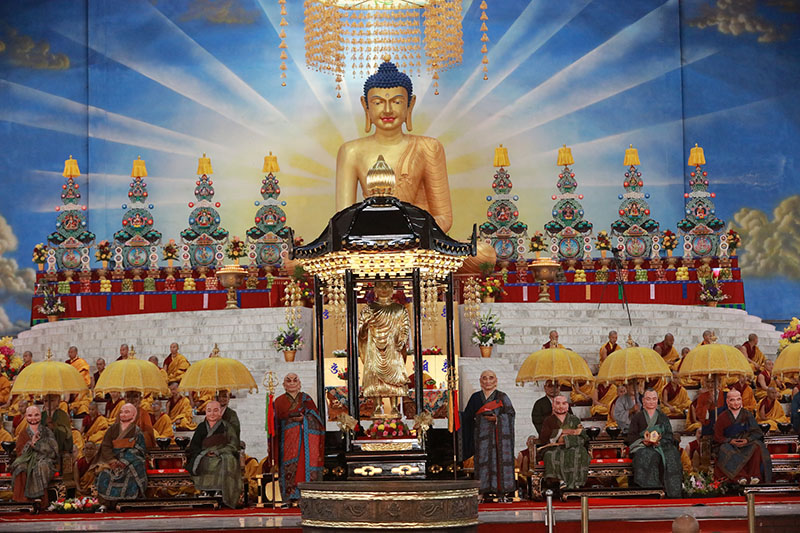 15. The assembly chanted an invitation to the buddhas while the golden statue was placed in the pavilion. The arhats were seated, and the gelongs and gelongmas were arrayed on the tiers of the stage behind and to the sides.