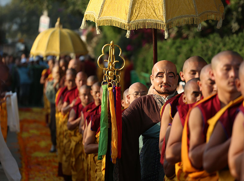 14. Finally, a carriage conveyed the standing Buddha, gleaming in the early morning sun, a parasol swirling just above its head.