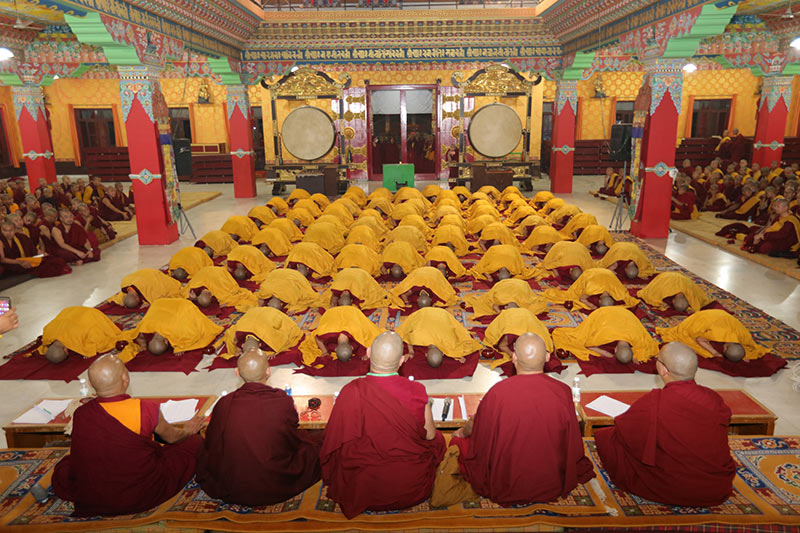 Each year, before the Monlam begins, the monks and nuns are put through their paces in front of a panel of judges. In 2014, at the 32nd Kagyu Monlam, the examination became an annual competition, with prizes awarded in two categories: gelong [fully ordained monks] and getsul and getsulma [novice monks and nuns]. In the latter category monks and nuns compete against each other equally.<br>