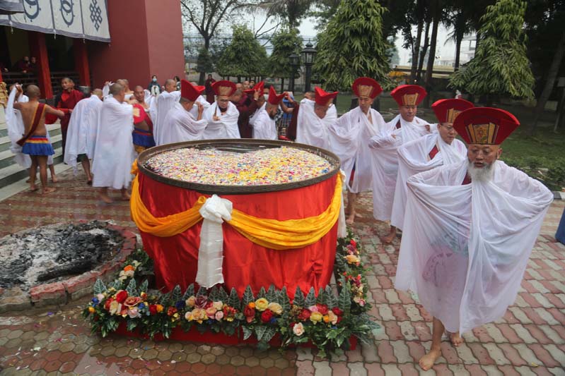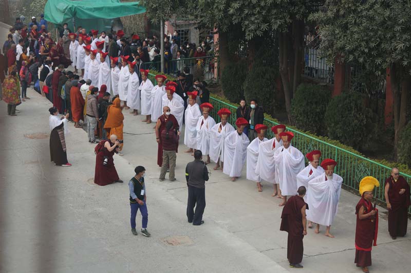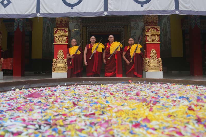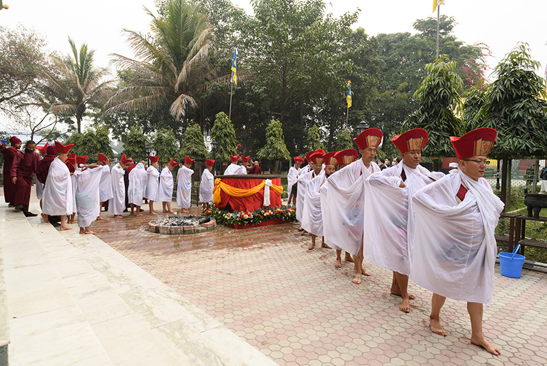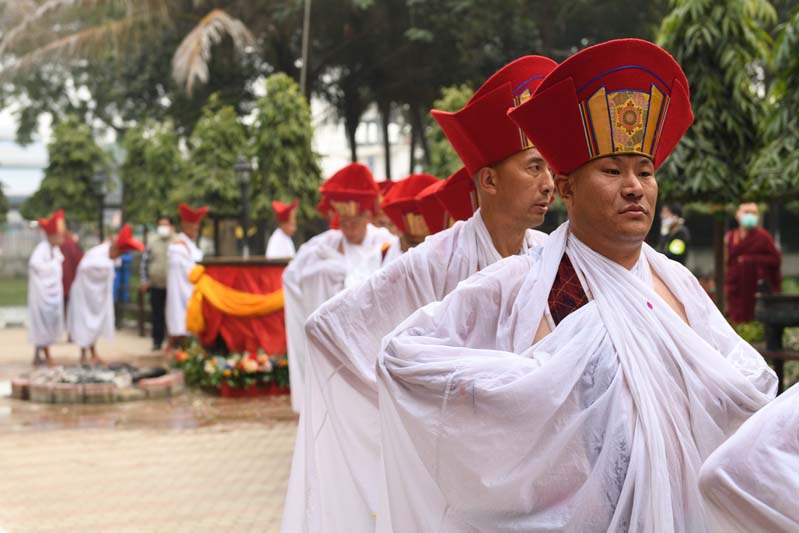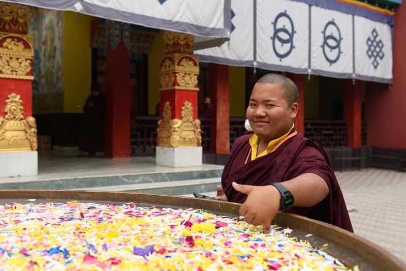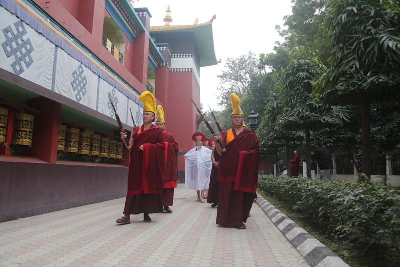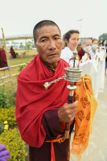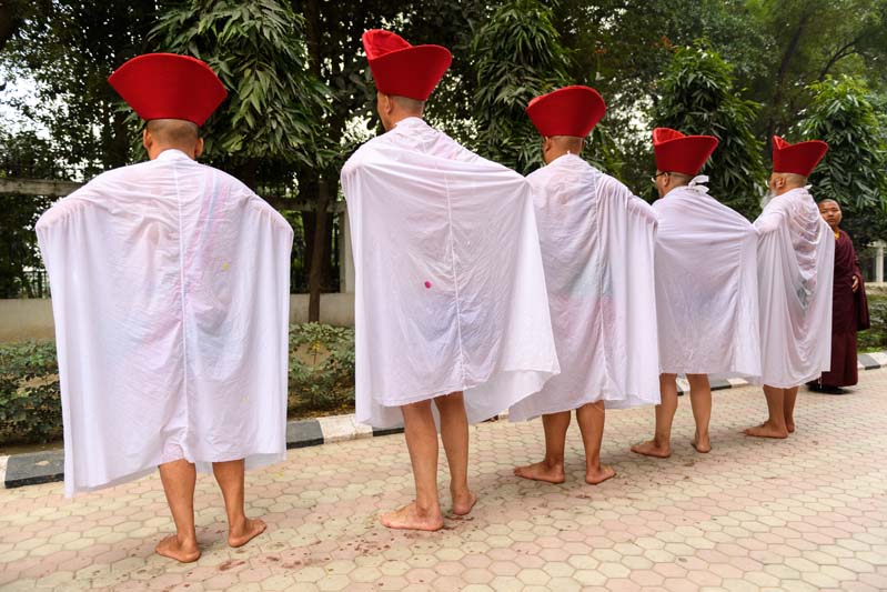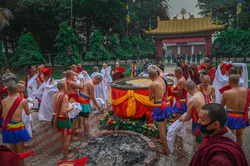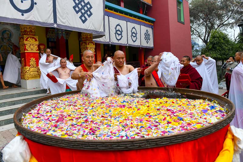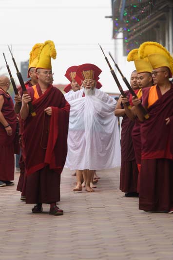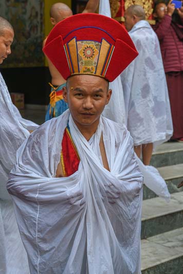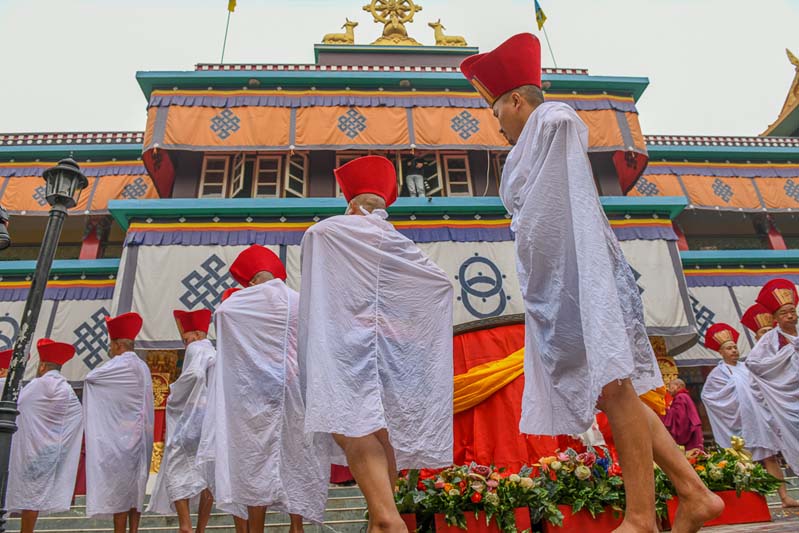 The annual procession of the Cotton-Clad, those who have completed a three year Karma Kagyu retreat, takes place on the final morning of the Monlam. During the Monlam, the retreatants practice in seclusion in the heavily-curtained, Tergar Monastery shrine room each evening, until the culmination is an all-night practice which begins at 8.00pm on the sixth day. On the seventh day, the yogins emerge from the shrine room, dip their thin cotton robes into a tank of cold water in order to demonstrate their proficiency in ‘tummo’, the generation of inner heat, and process to the Monlam Pavilion.