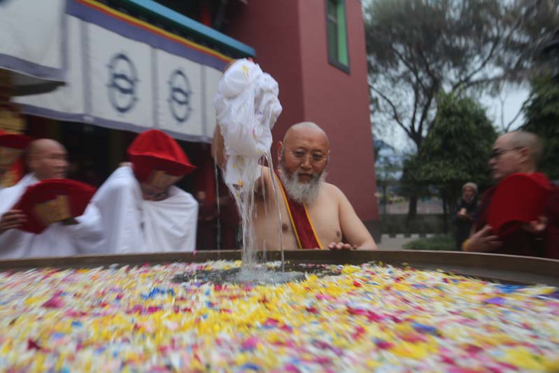 1. Drupon Dechen Rinpoche tests the water tank and finds it appropriately cold.