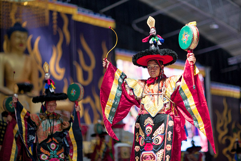 As the dancers are imagining themselves as the deity, they think that all the physical motions they make are the expressions of the deity or the deity’s motions. Likewise, the spectators of a lama dance should not think of lama dancing as an ordinary performance or ordinary dance. If you know how to practice the mantra, it is important to train in the pure perception connected with tantric practice and think that you are actually seeing the deity, meditating on faith. Purifying ourselves of the fixation on ordinary appearances is of primary importance in the mantra, so it is very important for the performers of lama dance to try to block the fixation on ordinary appearances and for the spectators as well to put effort into blocking fixation on ordinary appearances.