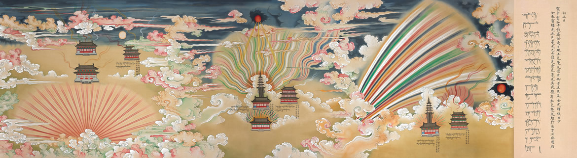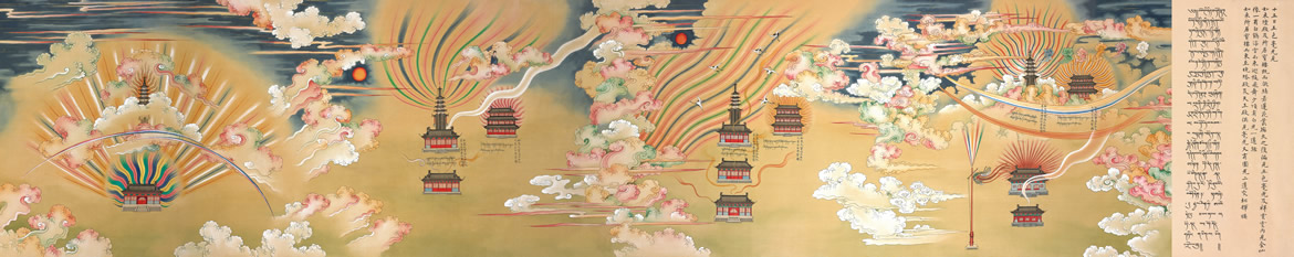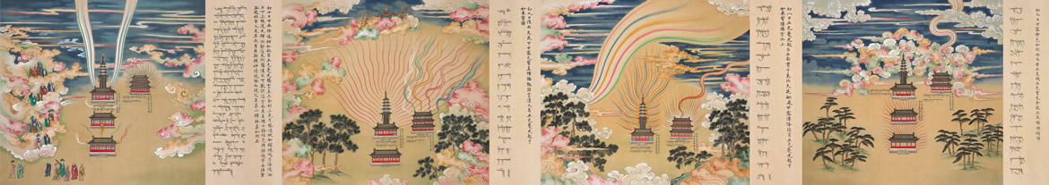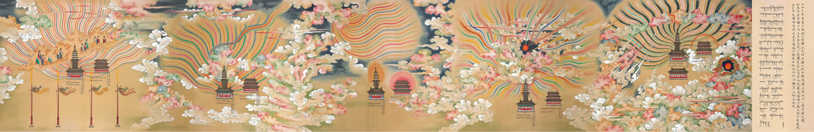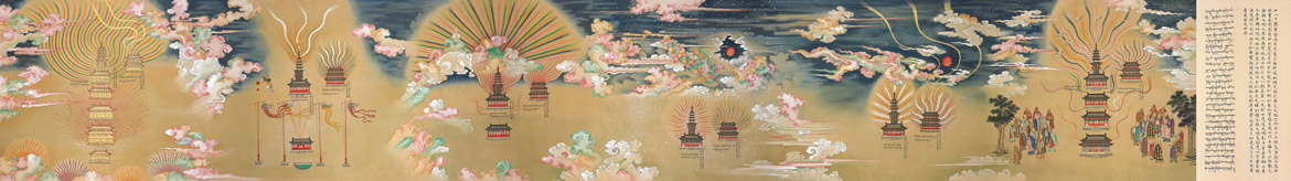 50 metres long and painted on silk, the scroll depicts scenes of miraculous signs that took place over twenty-two days during the performance of the ritual. These are described in Chinese, Arabic, Uighur, Tibetan and Mongolian.
