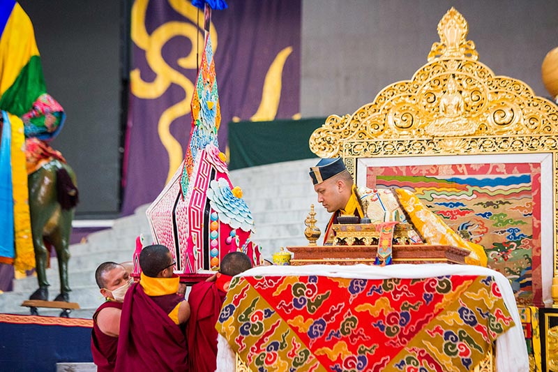 The first text was the short Mahakala practice known as the Cinnabar Mahakala since the first parts to be chanted were marked off in a brilliant red from the long text Burning Up Hostility by the Sixth Karmapa, Thongwa Dönden. At the end of this came a short section known as Receiving the Siddhi. At this time the Nyingzuk, the huge main torma sculpture that represents Mahakala, was carried by several people to give its blessing, first to the Dorje Lopon who has guided the pujas during the entire time. Then it was offered to the Karmapa and Gyaltsap Rinpoche, before being placed back on the shrine.