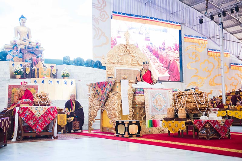The decoration of the Pavilion was much simpler as the focus shifted to the performances on the stage where rows of traditional benches were set up, like an unfolded fan, for the staff to be seated. His Holiness the Gyalwang Karmapa was seated in the center of the stage, beside him sat H.E. Goshir Gyaltsap Rinpoche. To the left of the stage sat the senior lay staff of the labrang and the Monlam, extending into the left wing with the remaining permanent lay Monlam staff. Rinpoches, tulkus and khenpos sat on the right side of the stage; behind them, the high-ranking monks from different monasteries sat on the tiers of the right wing.