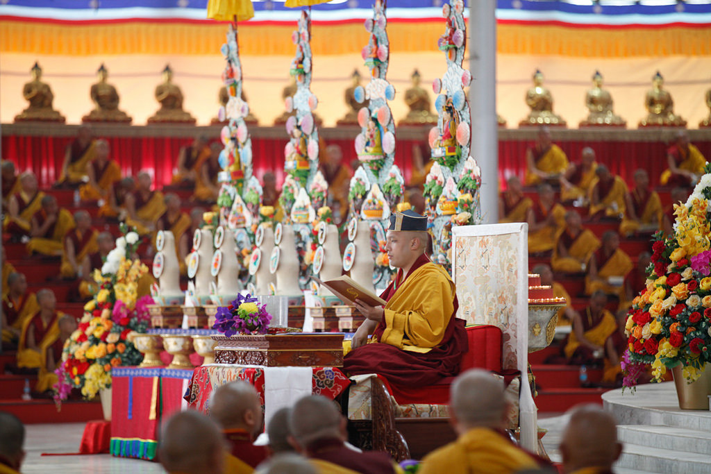 Afterward, the Karmapa explained that when he recites the dedications for the living and those passed away (from the collected works of the First Karmapa), he is acting as the representative of everyone, so we should all hold in mind the same prayer, wishing that all beings, as great in number as space is vast, and in particular all those connected to the Kagyu Monlam, have happiness and joy; that the living experience auspiciousness and those passed away find a good rebirth.