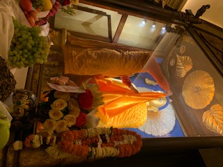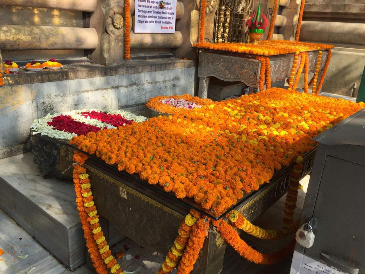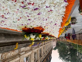 From February 16th to 17th they made extensive flower offerings, decorating the Mahabodhi temple grounds from the Ashoka gates to the temple boundary to the bodhi tree boundary, as well as flower offerings inside the Mahabodhi temple innermost circuit.