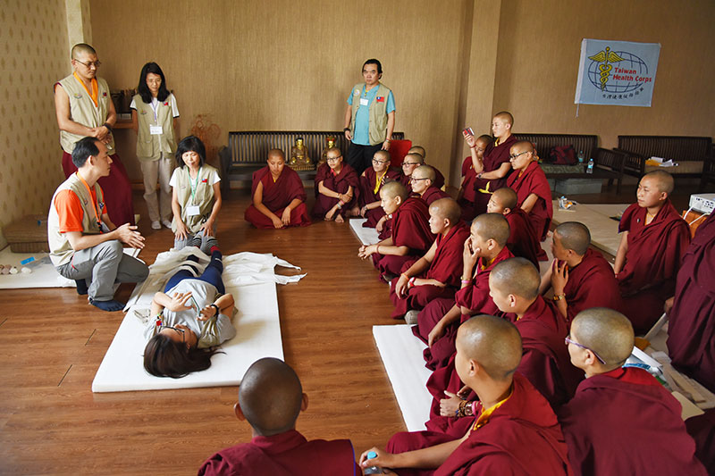Dr Jeffrey Chen, CEO of the Taiwanese based NGO Taiwan Health Corps, first responded to a request from the Gyalwang Karmapa to develop initiatives to improve the health and healthcare of nuns more than three years ago. This year he has returned for a third time with a team of six health professionals to provide basic training for a new batch of nuns. The team comprises Professor Kuo Su Chen, a specialist in Women’s Health, Dr Chin Min Yi, a doctor of traditional Chinese medicine, Dr Wei Cheng Chou, urologist and surgeon, Hsin-Yu Lee, an EMT instructor, and Nurse Practitioner Lee Shun Yun.