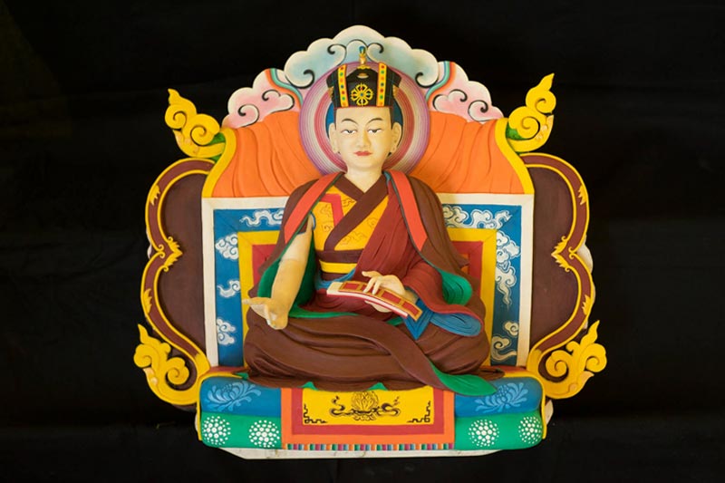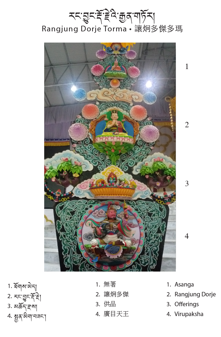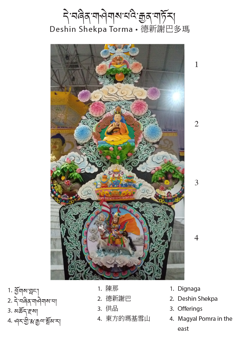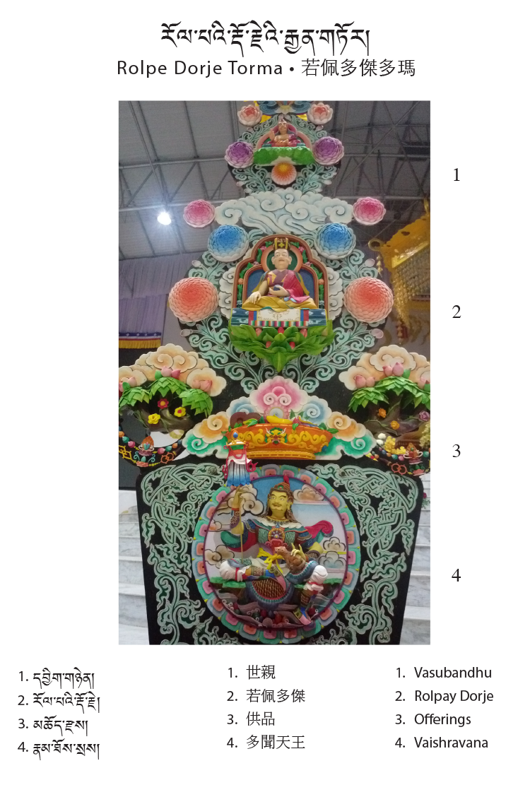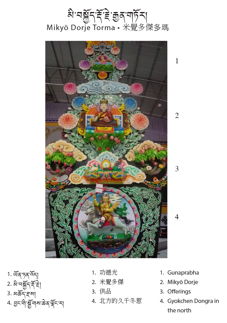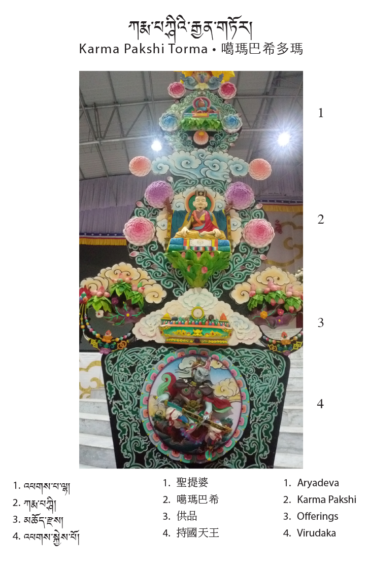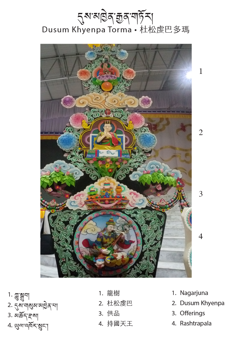The central theme of this year’s tormas are the first eight Karmapas; their depictions run across the center. On the upper level of the tormas are the Gyen Truk Chok Nyi (the Six Ornaments and the Two Supreme Ones). The six ornaments are: Nagarjuna, Aryadeva, Asanga, Dignaga, Vasubhandu, and Dharmakirti; the two supreme ones are Shakyaprabha and Gunaprabha.