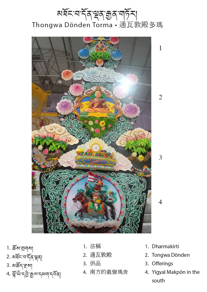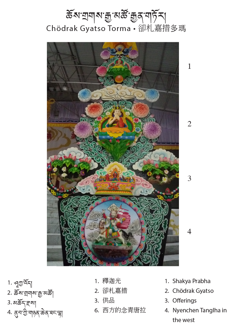 The Four Moutain Kings of Tibet are the powerful, fierce protector gods associated with famous moutains in Tibet. In the East, in Amdo is Majel Pumra; in the West is Nyenchen Thangla, in the South in southern Kham is Yejel, and in the North in northern Kham is Jogchen Dongrel. The worship of mountain gods was one of the most important forms of nature worship among ancient Tibetans and has continued to the present day. Here, the torma artists have done justice to their haughty magnificence. These eight tormas exhibit museum quality artwork but will most likely be destroyed at the end of this year’s events, a powerful reminder of the impermanence of all conditioned phenomena.