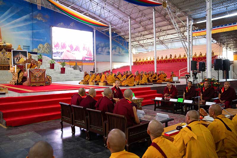 Last year, in response to a suggestion from the Gyalwang Karmapa, two evening debates were held during the 36th Kagyu Monlam. The first debate addressed the question of, “Is it proper to rely on worldly deities as a refuge?” and the second, “Is practice more important than study?” These were not traditional Tibetan- style debates nor were they fully Western-style. Rather, they were an experimental hybrid: two teams of four monks arguing opposing positions from a Buddhist perspective, using evidence from the sutras, commentaries, and Buddhist hagiographies.
