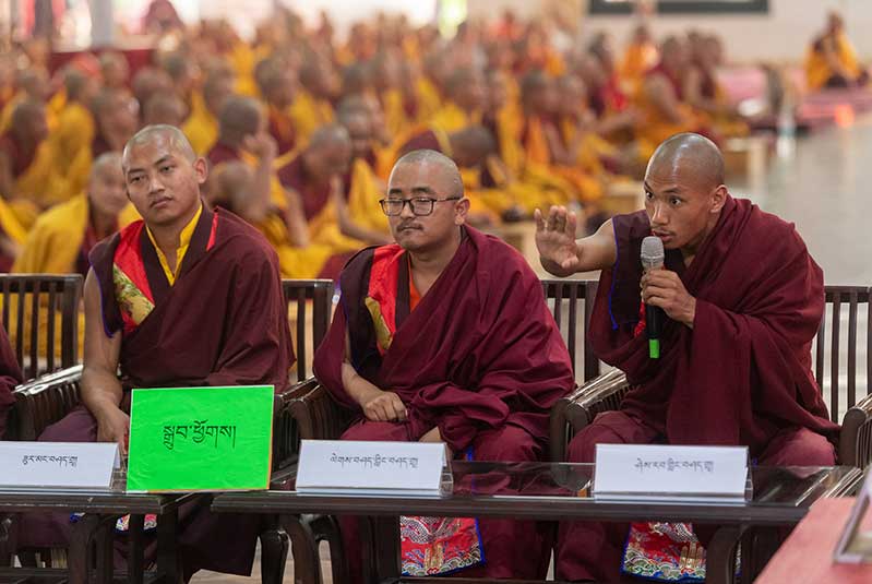 On this second day of the Pre-Monlam teachings, eight monks, selected from Karma Kagyu shedras (monastic colleges) and monasteries, participated in a western-style debate on the topic, “Is it proper for monastics to eat meat?” Khenpo Pema Osel from Surmang monastery moderated.
