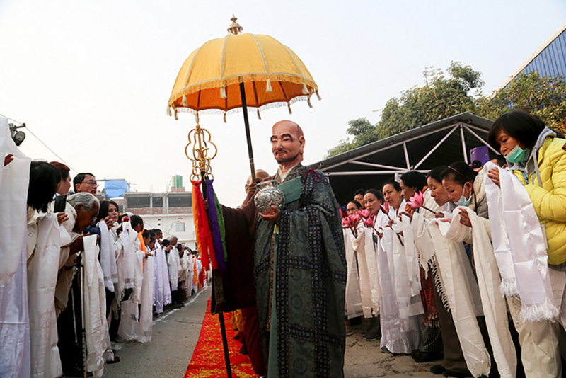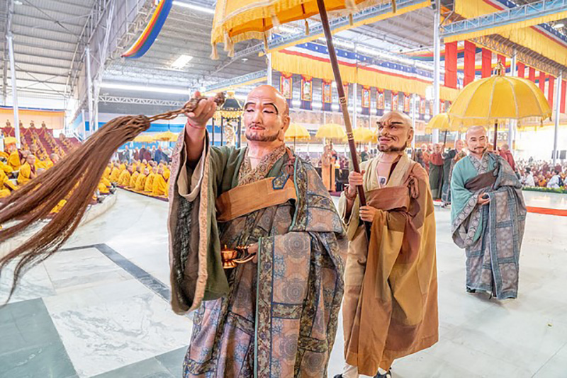 6. The Arhats and their retinues will walk along a beautiful, colourful carpet of designs made from flowers. Meanwhile, in the Pavillion, the congregation chants the prayer: Offerings to the Sixteen Arhats.