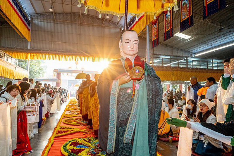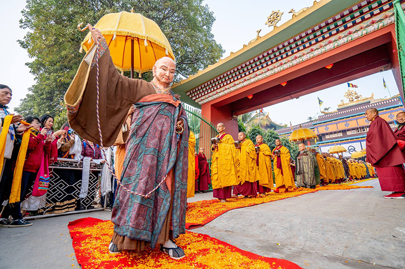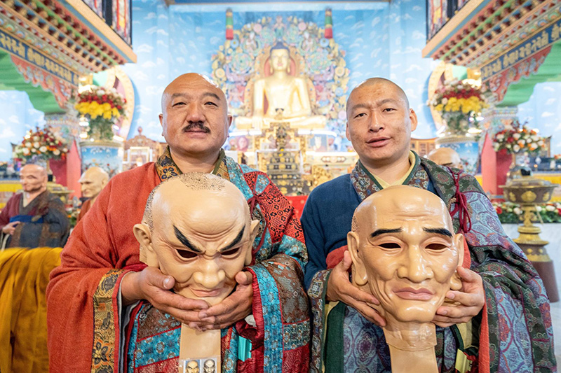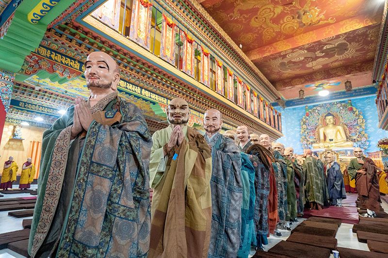 At the time of the 7th Karmapa, Chodrak Gyatso, there used to be a procession called the Chakkor, which went around the Great Encampment. Monks dressed as the Sixteen Arhats, accompanied by their retinue, formed part of that procession. The 9th Karmapa,Wangchuk Dorje, added the Buddha and two of his disciples to the procession.