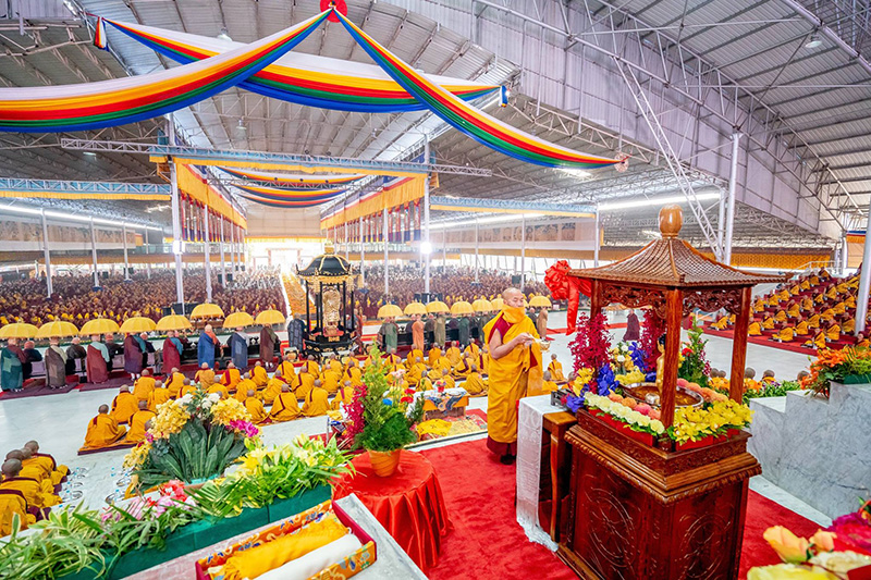 14. On stage, Gyaltsab Rinpoche, the Rinpoches, tulkus, khenpos and gelongs and gelongmas stand respectfully to receive the Arhats.