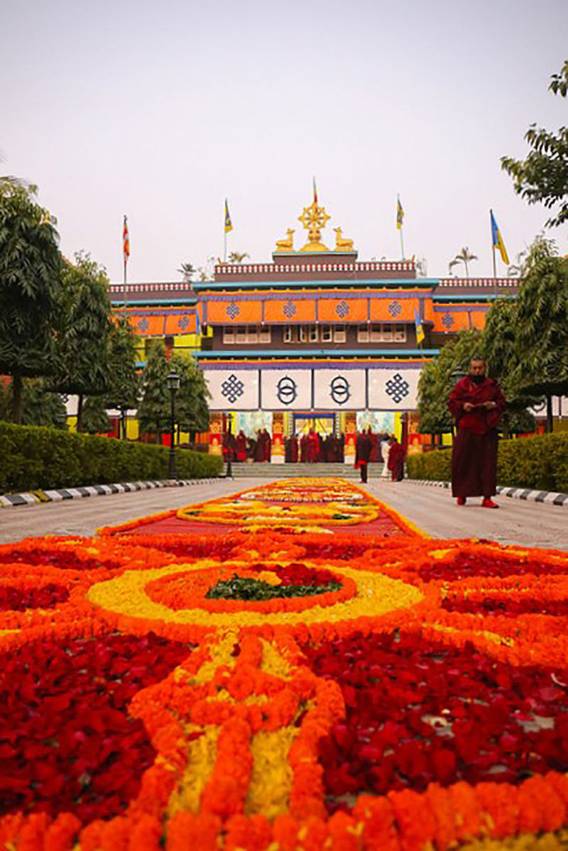 17. Slowly the Arhats weave their way through the Pavillion towards the stage, on a red carpet covered in orange and yellow marigolds.
