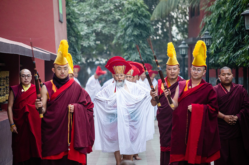 7. The procession begins with a circumambulation of Tergar Temple, led by the Drupon Lama (retreat master) of Rumtek Monastery and the Head Khenpo of Rumtek Shedra.