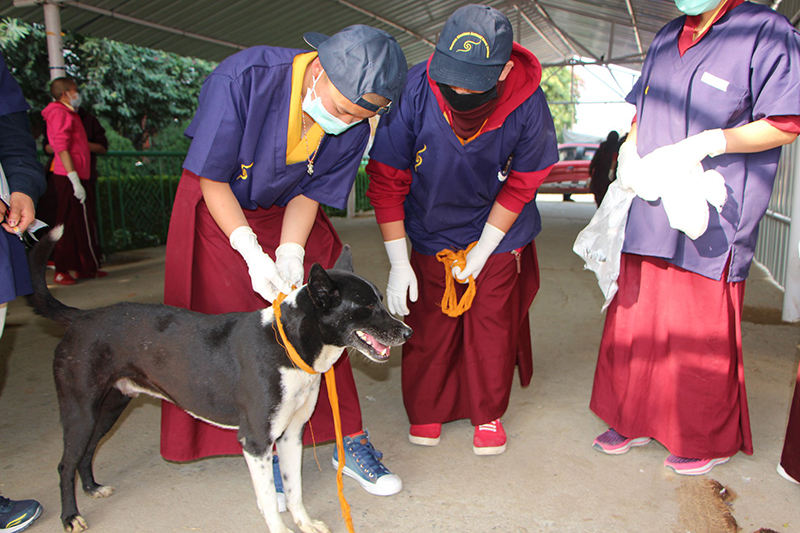 Twelve nuns from the six Kagyu Nunneries who are attending the Arya Kshema, will follow a special programme this year to train in animal first aid. Over ten days they will learn about rabies control, treating skin wounds, giving injections, and dog handling. The aim of the programme is that when they return to their nunneries, they will become the animal first aid officers not just for their nunnery but also for their local area. On completion of their training, they will be given a big first- aid box full of medicines, bandaging materials and equipment they need for this important job. This initiative is especially according to the wishes of the Karmapa, who wanted the nuns to have equal opportunity with the monks in this training.