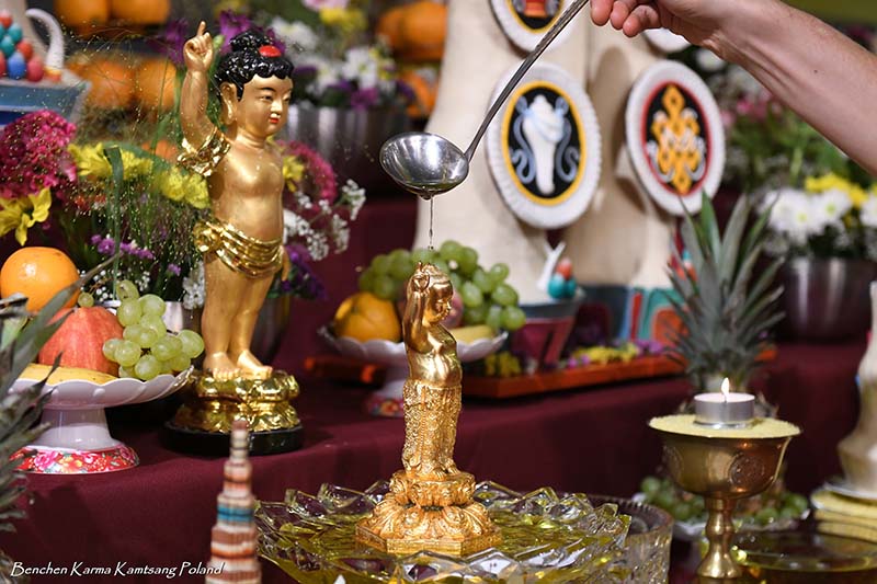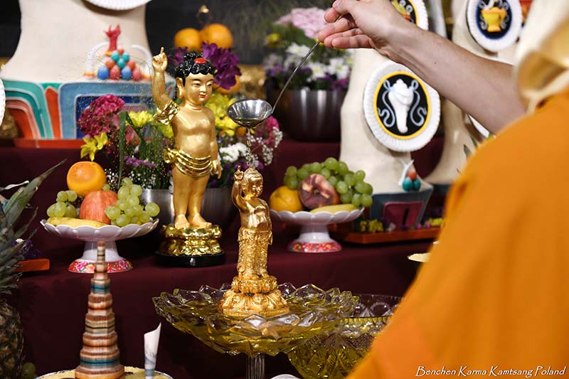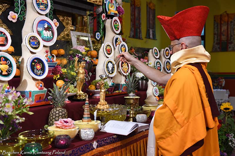 As is the tradition, on the first day we held a solemn procession with a portrait of His Holiness the Karmapa, Ogyen Trinley Dorje. After circumambulation of the stupa and the temple, the picture was placed on His Holiness’s throne, and Polish lamas offered a Mandala of the Universe and the symbols of Awakened Body, Speech, Mind, Qualities and Activity to the Gyalwang Karmapa - the source of all blessing and inspiration, and the supreme head of our lineage.