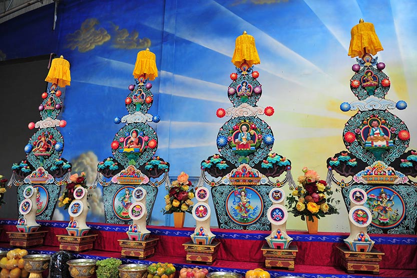 དེ་ཡང་དཔལ་༸རྒྱལ་དབང་ཀརྨ་མཆོག་གིས་ཕྱི་ལོ་ ༢༠༠༤ ལོ་ནས་བཀའ་བརྒྱུད་སྨོན་ལམ་གྱི་ཐུགས་འགན་ཐོག་མར་བཞེས་སྐབས། རང་རེ་སྒྲུབ་བརྒྱུད་པ་ཀུན་གྱི་མེས་པོ་རྗེ་མར་མི་དྭགས་གསུམ་གྱི་སྣང་བརྙན་གཏོར་མའི་གཟུགས་སུ་ཐོག་མར་བཞེངས་སྐྲུན་མཛད་པ་ནས་བཟུང་ལོ་རེ་བཞིན་བཀའ་བརྒྱུད་སྨོན་ལམ་སོ་སོར་བསྟན་འགྲོར་མཛད་རྗེས་བླ་ན་མེད་པའི་གངས་ལྗོངས་སྐྱེས་ཆེན་རྣམས་ཀྱི་སྐུ་བརྙན་དང་ཡི་དམ་ཆོས་སྲུང་ཁག་གི་སྐུ་བརྙན་གཏོར་མའི་ནང་བཞེངས་པའི་ལམ་སྲོལ་གསར་གཏོད་མཛད་པའི་རྒྱུན་མུ་མཐུད་ད་བར་སྐྱོང་བ་ལྟར། འདི་ལོ་བཀའ་བརྒྱུད་སྨོན་ལམ་སོ་ལྔ་པའི་སྐབས་སུ་ཡང་གཏོོར་མ་ཆེ་ཆུང་འཚམས་པ་བཞི་བཞི་ཕྱོགས་ཕན་ཚུན་དུ་སྒྲིག་སྟེ་དེ་དག་གི་སྟེང་དུ་ཉེ་བའི་སྲས་ཆེན་བརྒྱད་ཀྱི་སྣང་བརྙན་ཏེ། སྲས་ཆེན་བརྒྱད་པོ་ནི། འཇམ་དབྱངས། སྤྱན་རས་གཟིགས། ཕྱག་ན་རྡོ་རྗེ། བྱམས་པ། ཀུན་ཏུ་བཟང་པོ། ས་ཡི་སྙིང་པོ། སྒྲིབ་པ་རྣམ་སེལ། ནམ་མཁའི་སྙིང་པོ་སྟེ་བརྒྱད་དང་། དབུས་སུ་སྒྲུབ་བརྒྱུད་ཤིང་རྟ་བརྒྱད་ཀྱི་སྣང་བརྙན་བསྐྲུན་ཡོད། སྒྲུབ་བརྒྱུད་ཤིང་རྟ་བརྒྱད་པོ་ནི། སྔ་འགྱུར་རྙིང་མ་བ། བཀའ་གདམས་པ། ལམ་འབྲས་པ། མར་པ་བཀའ་བརྒྱུད། ཤངས་པ་བཀའ་བརྒྱུད། ཞི་བྱེད་པ། སྦྱོར་དྲུག་པ། རྡོ་རྗེ་གསུམ་གྱི་བསྙེན་སྒྲུབ་སོ་སོའི་བསྟན་བདག་བླ་མ་རྣམས་ཀྱི་སྣང་བརྙན་བཅོས་ཡོད། དེ་བཞིན་གཤམ་དུ་མཆོད་པའི་ལྷ་མོ་བརྒྱད་ཀྱི་སྐུ་བརྙན་བཅས་ཡོད། དེ་ལྟར་བཅའ་བའི་དགོས་དོན་ནི། རིས་མེད་རྒྱལ་བསྟན་ཀུན་ལ་དག་སྣང་སྦྱོང་བའི་ཕྱིར་དང་། དེ་ཉིད་ལ་བརྟེན་ནས་མཉམ་མེད་བུ་རམ་ཤིང་པའི་རིང་ལུགས་ལུང་རྟོགས་ཀྱི་ཆོས་ཚུལ་དྲི་མ་མེད་པ་འདི་བཞིན་ཡངས་པའི་འཇིག་རྟེན་ཀུན་ཏུ་དར་ཞིང་རྒྱས་ལ་ཡུན་དུ་གནས་པ་དང། དེ་འཛིན་གྱི་རིས་མེད་པའི་སྐྱེས་ཆེན་རྣམས་ཀྱི་སྐུ་ཚེ་ཞབས་པད་ཡུན་དུ་བརྟན་ཅིང། བསྟན་འགྲོའི་མཛད་འཕྲིན་འཕེལ་བ། མཁའ་ཁྱབ་འགྲོ་བ་མ་ལུས་ཞི་བདེའི་དཔལ་ལ་གནས་པ་དང། འབྱུང་བ་དགྲར་ལངས་ཀྱི་གནོད་འཚེ་མཐའ་དག་ལས་སྐྱོབ་ཅིང། ཞི་བསིལ་རྫོགས་ལྡན་གྱི་དཔལ་ལ་ལོངས་སྤྱོད་པའི་སྨོན་འདུན་གྱི་སླད་དུ་ཡིན། བསྟན་འཛིན་རྣམ་རྒྱལ་ནས།