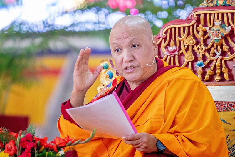 ཕྱི་ལོ། ༢༠༡༩ ཟླ་བ། ༡ ཚེས། ༩ རེས་གཟའ་ལྷག་པའི་ཕྱི་དྲོའི་ཆོས་ཐུན་དང་པོ། ཕྱག་ཚོད། ༢ ནས། སྡུག་བསྔལ་བཟོད་ལྡན་བློ་ལྡན་ནཱ་ནོ་པ། །སྐལ་ལྡན་ཁྱོད་ཀྱི་བློ་ལ་འདིི་ལྟར་བྱོས། ཞེས་པ་སྟེ། སྡུག་བསྔལ་བཟོད་ལྡན་ནི། ཆོས་སྒྲུབ་པའི་སྐབས་སྡུག་བསྔལ་དང་དུ་ལེན་པ། མི་ཁ་དང་བྱུར། ལྟས་ངན་སོགས་ཕྱིན་ཅི་ལོག་པའི་བར་ཆད་ཇི་ཙམ་བ། དེ་དག་དངོས་གྲུབ་ཡིན་བསམ་ནས། དགའ་བ་སྒོམ་པ། རྗེ་བཙུན་མི་ལ་རས་པ་ལྟ་བུ། ཚ་གྲང་བཀྲེས་སྐོམ་གང་བྱུང་ནའང་ཇི་མི་སྙམ་པ། ཚེ་འདིར་ཉམས་ལེན་མཐར་ཕྱིན་པ་ཞིག །ཚེ་དང་སྒྲུབ་པ་སྙོམས་པ་ཞིག་མ་བྱུང་གི་བར་དུ་ངའི་ལུས་ངག་ཡིད་གསུམ་རྣམ་གཡེང་དབང་དུ་མི་གཏང་། འགྲོ་འདུག་གི་སྤྱོད་ལམ་ཐམས་ཅད་ཕྱིན་ཅི་ལོག་པའི་རྟོག་པའི་དབང་དུ་མི་འགྲོ། སྒོ་གསུམ་དགེ་བའི་ཐོག་ལ་རྐྱེན་གང་གིས་ཀྱང་རག་མི་ལས་པ། འགྲོ་ན་འགྲོ་ཐོག །འདུག་ན་འདུག་ཐོག། །སྤྱོད་ལམ་གང་ཡིན་ན་ཡང་བྱང་ཆུབ་ལམ་དུ་འཁྱེར་ཐུབ་པ་ཞིག་བྱེད་པ་དེ་སྡུག་བསྔལ་བཟོད་ལྡན་ཡིན། རྗེ་མི་ལའིི་མགུར་ལས། སྙིང་རུས་སྡུག་བསྲན་གྱི་སྒྲུབ་པ་དེ། ཕ་བླ་མ་མཉེས་པའི་ཞབས་ཏོག་ཡིན་ཞེས། སྐལ་ལྡན་ཁྱོད་ནི། ནཱ་རོ་པ་ལ་གོ བསམ་བློ་དེ་ལྟར་ཐོངས་ཞེས། བློ་ལྡན་ཞེས་པའི་བློ་དེ་བློ་ཁྱད་པར་བ་ཞིག །རྣམ་པར་དཔྱོད་པའི་བློ་ཞིག་གོ།