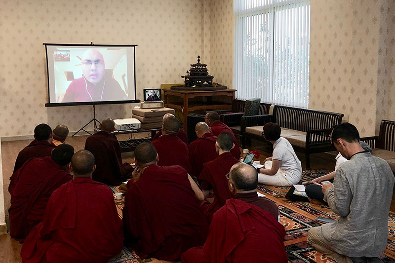 རྒྱལ་དབང་མཆོག་ནས་བཀའ་བརྒྱུད་སྨོན་ལམ་གྲ་སྒྲིག་ཚོགས་པའི་བརྙན་ཕྲིན་ཚོགས་འདུའི་གཙོ་སྐྱོང་གནང་བཞིན་པ།