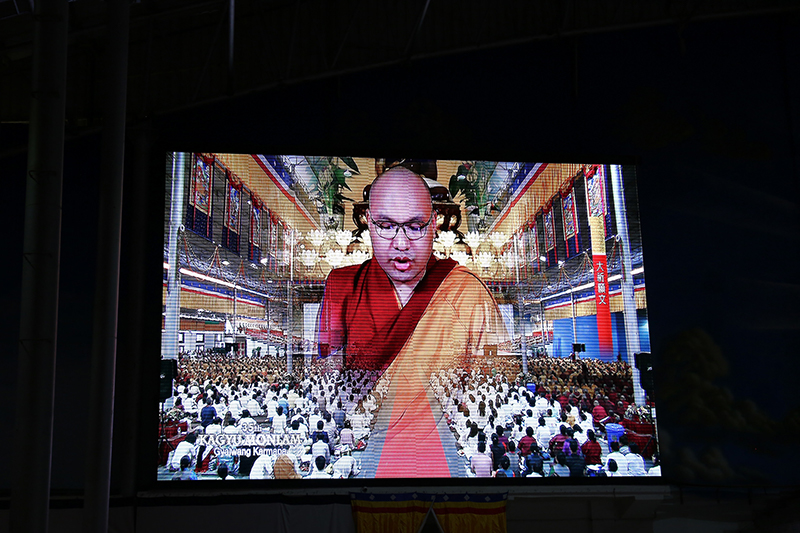 (法王開示完畢,大銀幕上影相消失,留下全場一陣愕然相對,沒想到法王影相很快再次出現,戴起事業黑寶冠念誦本次法會最後一次〈大祈願文〉,也許是想到多難的傳承及難忍能忍的法王,現場人人以震懾未已的空前專注,諦聽法王念誦〈大祈願文〉,真的感覺字字入心。