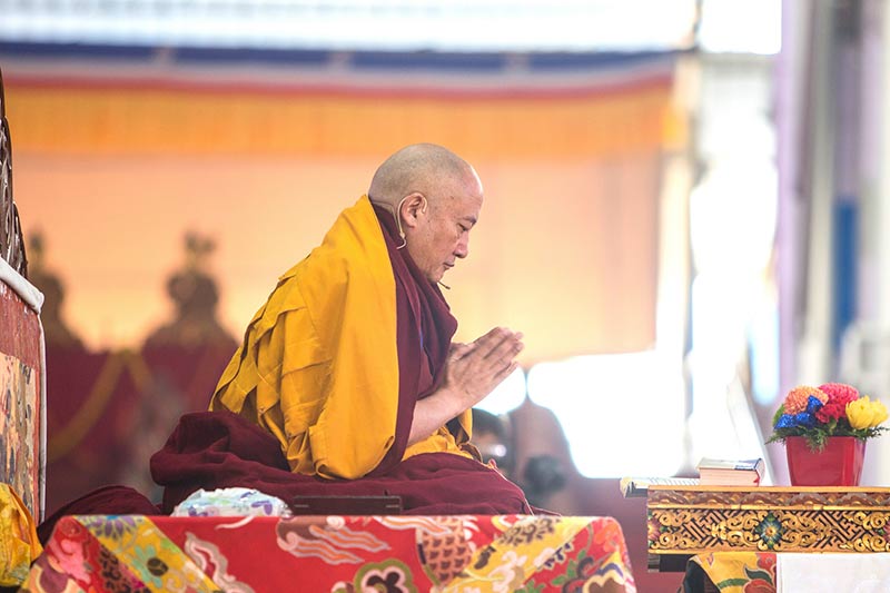 這是第36屆噶舉祈願法會正行第一天,上午9:00,第二座法,在大眾唱誦皈依發心、普賢行願品、獻曼達、菩薩戒傳承祈請文、請轉法輪之後,剛依傳統去正覺大塔向佛陀聖像供養法衣的國師嘉察仁波切,陞法座,開始連續四天的《修心七要》課程第一天的開示: