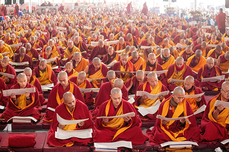 9. 持誦甘珠爾大藏經,是累積無量功德最微妙方式之一。傳統上,金剛乘可以念誦甘珠爾大藏經,為眾生祈福。甘珠爾經共有103卷,由103位沙彌,依照卷數,一排一排分給在場所有會唸誦藏文者。