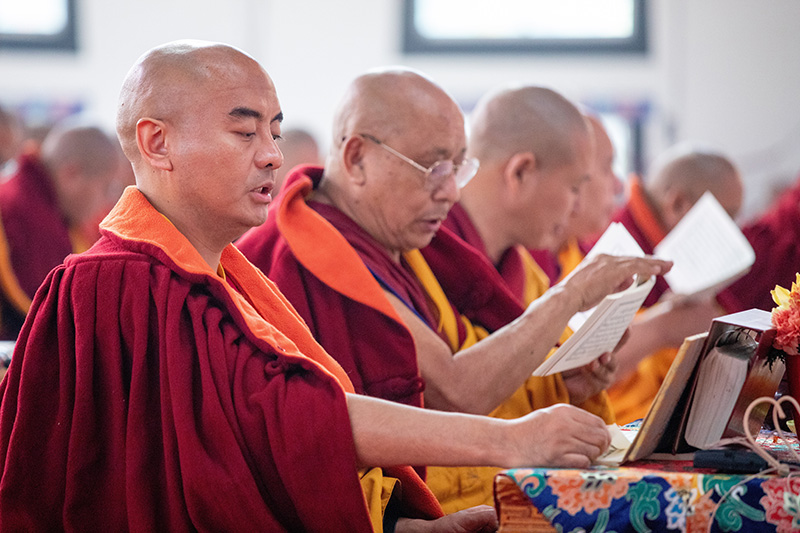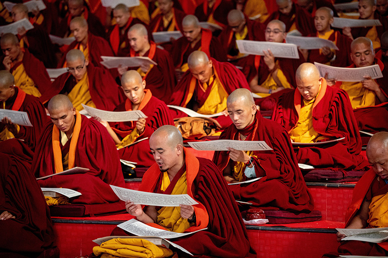 12. 坐於舞台兩側階梯區,象徵五百羅漢的比丘們,凝神念誦,將一己之學習融入甘珠爾經文的念誦音海中。